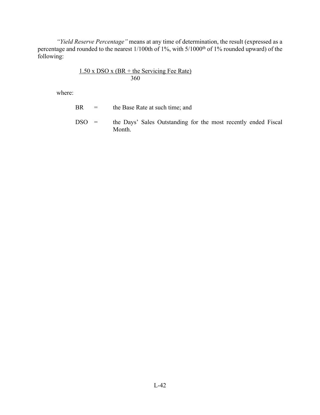 L-42 “Yield Reserve Percentage” means at any time of determination, the result (expressed as a percentage and rounded to the nearest 1/100th of 1%, with 5/1000th of 1% rounded upward) of the following: 1.50 x DSO x (BR + the Servicing Fee Rate) 360 where: BR = the Base Rate at such time; and DSO = the Days’ Sales Outstanding for the most recently ended Fiscal Month.