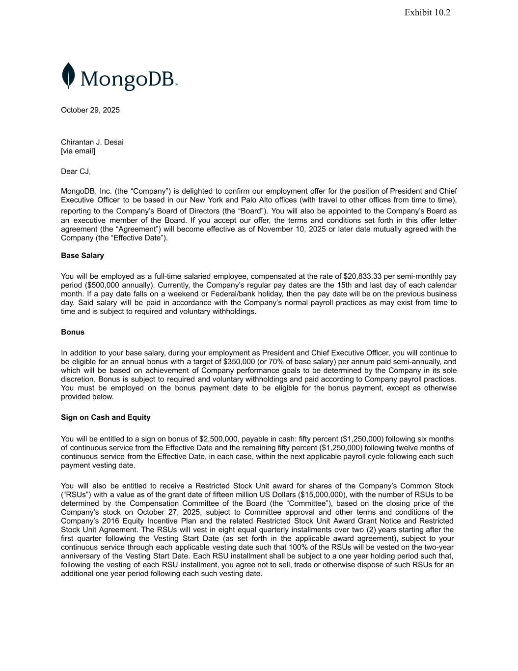 ​October 29, 2025​ ​Chirantan J. Desai​ ​[via email]​ ​Dear CJ,​ ​MongoDB,​​Inc.​​(the​​“Company”)​​is​​delighted​​to​​confirm​​our​​employment​​offer​​for​​the​​position​​of​​President​​and​​Chief​ ​Executive​ ​Officer​ ​to​ ​be​​based​​in​​our​​New​​York​​and​​Palo​​Alto​​offices​​(with​​travel​​to​​other​​offices​​from​​time​​to​​time),​ ​reporting​​to​​the​​Company’s​​Board​​of​​Directors​​(the​​“Board”).​ ​You​​will​ ​also​​be​​appointed​​to​​the​​Company’s​​Board​​as​ ​an​ ​executive​ ​member​ ​of​ ​the​ ​Board.​ ​If​ ​you​ ​accept​ ​our​ ​offer,​ ​the​ ​terms​ ​and​ ​conditions​ ​set​ ​forth​ ​in​ ​this​ ​offer​ ​letter​ ​agreement​​(the​​“Agreement”)​​will​ ​become​​effective​​as​​of​​November​​10,​​2025​​or​​later​​date​​mutually​​agreed​​with​​the​ ​Company (the “Effective Date”).​ ​Base Salary​ ​You​​will​ ​be​​employed​​as​​a​​full-time​​salaried​​employee,​​compensated​​at​​the​​rate​​of​​$20,833.33​​per​​semi-monthly​​pay​ ​period​​($500,000​​annually).​​Currently,​​the​​Company’s​​regular​​pay​​dates​​are​​the​​15th​​and​​last​​day​​of​​each​​calendar​ ​month.​​If​​a​​pay​​date​​falls​​on​​a​​weekend​​or​​Federal/bank​​holiday,​​then​​the​​pay​​date​​will​​be​​on​​the​​previous​​business​ ​day.​ ​Said​ ​salary​ ​will​ ​be​ ​paid​​in​​accordance​​with​​the​​Company’s​​normal​​payroll​​practices​​as​​may​​exist​​from​​time​​to​ ​time and is subject to required and voluntary withholdings.​ ​Bonus​ ​In​​addition​​to​​your​​base​​salary,​​during​​your​​employment​​as​​President​​and​​Chief​​Executive​​Officer,​​you​​will​​continue​​to​ ​be​​eligible​​for​​an​​annual​​bonus​​with​​a​​target​​of​​$350,000​​(or​​70%​​of​​base​​salary)​​per​​annum​​paid​​semi-annually,​​and​ ​which​ ​will​ ​be​ ​based​ ​on​ ​achievement​ ​of​​Company​​performance​​goals​​to​​be​​determined​​by​​the​​Company​​in​​its​​sole​ ​discretion.​​Bonus​​is​​subject​​to​​required​​and​​voluntary​​withholdings​​and​​paid​​according​​to​​Company​​payroll​​practices.​ ​You​ ​must​ ​be​ ​employed​ ​on​ ​the​ ​bonus​ ​payment​ ​date​ ​to​ ​be​ ​eligible​ ​for​ ​the​ ​bonus​ ​payment,​ ​except​ ​as​ ​otherwise​ ​provided below.​ ​Sign on Cash and Equity​ ​You​​will​​be​​entitled​​to​​a​​sign​​on​​bonus​​of​​$2,500,000,​​payable​​in​​cash:​​fifty​​percent​​($1,250,000)​​following​​six​​months​ ​of​​continuous​​service​​from​​the​​Effective​​Date​​and​​the​​remaining​​fifty​​percent​​($1,250,000)​​following​​twelve​​months​​of​ ​continuous​​service​​from​​the​​Effective​​Date,​​in​​each​​case,​​within​​the​​next​​applicable​​payroll​​cycle​​following​​each​​such​ ​payment vesting date.​ ​You​ ​will​ ​also​ ​be​ ​entitled​ ​to​ ​receive​ ​a​ ​Restricted​ ​Stock​ ​Unit​ ​award​ ​for​ ​shares​ ​of​ ​the​ ​Company’s​ ​Common​ ​Stock​ ​(“RSUs”)​​with​​a​​value​​as​​of​​the​​grant​​date​​of​​fifteen​​million​​US​​Dollars​​($15,000,000),​​with​​the​​number​​of​​RSUs​​to​​be​ ​determined​ ​by​ ​the​ ​Compensation​ ​Committee​ ​of​ ​the​ ​Board​ ​(the​ ​“Committee”),​ ​based​ ​on​ ​the​ ​closing​ ​price​ ​of​ ​the​ ​Company’s​ ​stock​ ​on​ ​October​ ​27,​ ​2025,​ ​subject​ ​to​ ​Committee​ ​approval​ ​and​ ​other​ ​terms​ ​and​ ​conditions​ ​of​ ​the​ ​Company’s​ ​2016​ ​Equity​ ​Incentive​ ​Plan​ ​and​ ​the​ ​related​ ​Restricted​ ​Stock​ ​Unit​ ​Award​​Grant​​Notice​​and​​Restricted​ ​Stock​​Unit​​Agreement.​​The​​RSUs​​will​ ​vest​​in​​eight​​equal​​quarterly​​installments​​over​​two​​(2)​​years​​starting​​after​​the​ ​first​ ​quarter​ ​following​ ​the​ ​Vesting​ ​Start​ ​Date​ ​(as​ ​set​ ​forth​ ​in​ ​the​ ​applicable​ ​award​ ​agreement),​ ​subject​ ​to​ ​your​ ​continuous​​service​​through​​each​​applicable​​vesting​​date​​such​​that​​100%​​of​​the​​RSUs​​will​​be​​vested​​on​​the​​two-year​ ​anniversary​​of​​the​​Vesting​​Start​​Date.​​Each​​RSU​​installment​​shall​​be​​subject​​to​​a​​one​​year​​holding​​period​​such​​that,​ ​following​​the​​vesting​​of​​each​​RSU​​installment,​