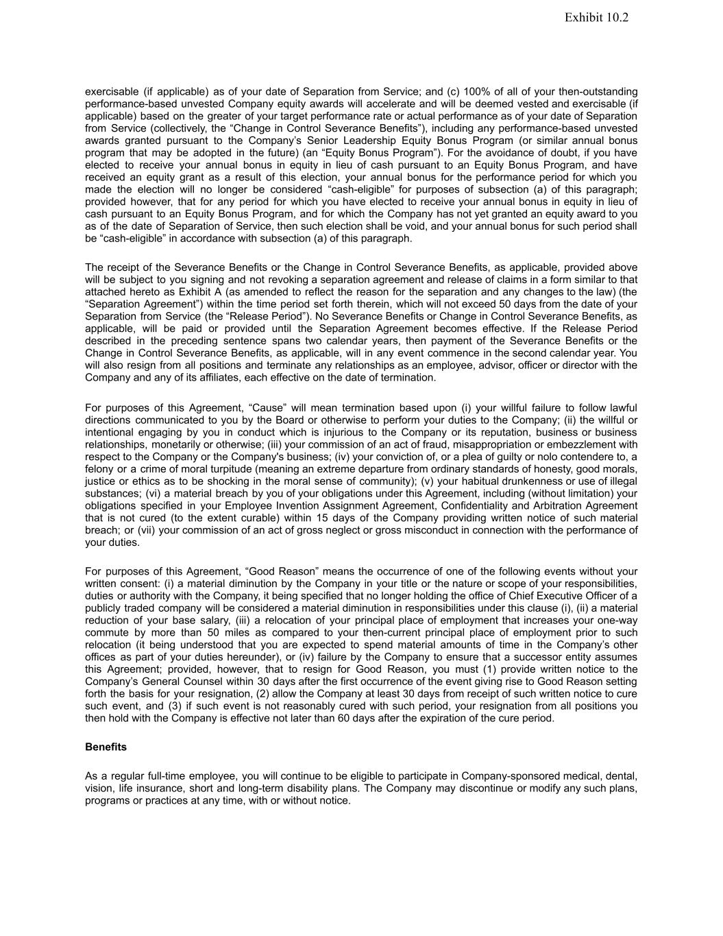 ​exercisable​ ​(if​ ​applicable)​ ​as​​of​​your​​date​​of​​Separation​​from​​Service;​​and​​(c)​​100%​​of​​all​ ​of​​your​​then-outstanding​ ​performance-based​​unvested​​Company​​equity​​awards​​will​ ​accelerate​​and​​will​ ​be​​deemed​​vested​​and​​exercisable​​(if​ ​applicable)​​based​​on​​the​​greater​​of​​your​​target​​performance​​rate​​or​​actual​​performance​​as​​of​​your​​date​​of​​Separation​ ​from​ ​Service​​(collectively,​​the​​“Change​​in​​Control​​Severance​​Benefits”),​​including​​any​​performance-based​​unvested​ ​awards​ ​granted​ ​pursuant​ ​to​ ​the​ ​Company’s​ ​Senior​ ​Leadership​ ​Equity​ ​Bonus​ ​Program​ ​(or​ ​similar​ ​annual​ ​bonus​ ​program​ ​that​ ​may​ ​be​ ​adopted​ ​in​ ​the​​future)​​(an​​“Equity​​Bonus​​Program”).​​For​​the​​avoidance​​of​​doubt,​​if​ ​you​​have​ ​elected​ ​to​ ​receive​ ​your​ ​annual​ ​bonus​ ​in​ ​equity​ ​in​ ​lieu​ ​of​ ​cash​ ​pursuant​ ​to​ ​an​ ​Equity​ ​Bonus​ ​Program,​ ​and​ ​have​ ​received​ ​an​ ​equity​ ​grant​ ​as​ ​a​ ​result​ ​of​ ​this​ ​election,​ ​your​ ​annual​ ​bonus​ ​for​​the​​performance​​period​​for​​which​​you​ ​made​ ​the​ ​election​ ​will​ ​no​ ​longer​ ​be​ ​considered​ ​“cash-eligible”​ ​for​ ​purposes​ ​of​ ​subsection​ ​(a)​ ​of​ ​this​ ​paragraph;​ ​provided​ ​however,​ ​that​ ​for​ ​any​ ​period​ ​for​ ​which​​you​​have​​elected​​to​​receive​​your​​annual​​bonus​​in​​equity​​in​​lieu​​of​ ​cash​​pursuant​​to​​an​​Equity​​Bonus​​Program,​​and​​for​​which​​the​​Company​​has​​not​​yet​​granted​​an​​equity​​award​​to​​you​ ​as​​of​​the​​date​​of​​Separation​​of​​Service,​​then​​such​​election​​shall​​be​​void,​​and​​your​​annual​​bonus​​for​​such​​period​​shall​ ​be “cash-eligible” in accordance with subsection (a) of this paragraph.​ ​The​​receipt​​of​​the​​Severance​​Benefits​​or​​the​​Change​​in​​Control​​Severance​​Benefits,​​as​​applicable,​​provided​​above​ ​will​ ​be​​subject​​to​​you​​signing​​and​​not​​revoking​​a​​separation​​agreement​​and​​release​​of​​claims​​in​​a​​form​​similar​​to​​that​ ​attached​​hereto​​as​​Exhibit​​A​​(as​​amended​​to​​reflect​​the​​reason​​for​​the​​separation​​and​​any​​changes​​to​​the​​law)​​(the​ ​“Separation​​Agreement”)​​within​​the​​time​​period​​set​​forth​​therein,​​which​​will​​not​​exceed​​50​​days​​from​​the​​date​​of​​your​ ​Separation​​from​​Service​​(the​​“Release​​Period”).​​No​​Severance​​Benefits​​or​​Change​​in​​Control​​Severance​​Benefits,​​as​ ​applicable,​ ​will​ ​be​ ​paid​ ​or​ ​provided​ ​until​ ​the​ ​Separation​ ​Agreement​ ​becomes​ ​effective.​ ​If​ ​the​ ​Release​ ​Period​ ​described​ ​in​ ​the​ ​preceding​ ​sentence​ ​spans​ ​two​ ​calendar​ ​years,​ ​then​ ​payment​ ​of​ ​the​ ​Severance​ ​Benefits​ ​or​ ​the​ ​Change​​in​​Control​​Severance​​Benefits,​​as​​applicable,​​will​ ​in​​any​​event​​commence​​in​​the​​second​​calendar​​year.​​You​ ​will​ ​also​​resign​​from​​all​​positions​​and​​terminate​​any​​relationships​​as​​an​​employee,​​advisor,​​officer​​or​​director​​with​​the​ ​Company and any of its affiliates, each effective on the date of termination.​ ​For​ ​purposes​ ​of​ ​this​ ​Agreement,​ ​“Cause”​ ​will​ ​mean​ ​termination​ ​based​ ​upon​ ​(i)​ ​your​ ​willful​ ​failure​ ​to​ ​follow​​lawful​ ​directions​ ​communicated​​to​​you​​by​​the​​Board​​or​​otherwise​​to​​perform​​your​​duties​​to​​the​​Company;​​(ii)​​the​​willful​​or​ ​intentional​ ​engaging​ ​by​ ​you​ ​in​ ​conduct​ ​which​ ​is​ ​injurious​ ​to​ ​the​ ​Company​ ​or​ ​its​ ​reputation,​ ​business​​or​​business​ ​relationships,​​monetarily​​or​​otherwise;​​(iii)​​your​​commission​​of​​an​​act​​of​​fraud,​​misappropriation​​or​​embezzlement​​with​ ​respect​​to​​the​​Company​​or​​the​​Company's​​business;​​(iv)​​your​​conviction​​of,​​or​​a​​plea​​of​​guilty​​or​​nolo​​contendere​​to,​​a​ ​felony​​or​​a​​crime​​of​​moral​​turpitude​​(meaning​​an​​extreme​​departure​​from​​ordinary​​standards​​of​​honesty,​​good​​morals,​ ​justice​​or​​ethics​​as​​