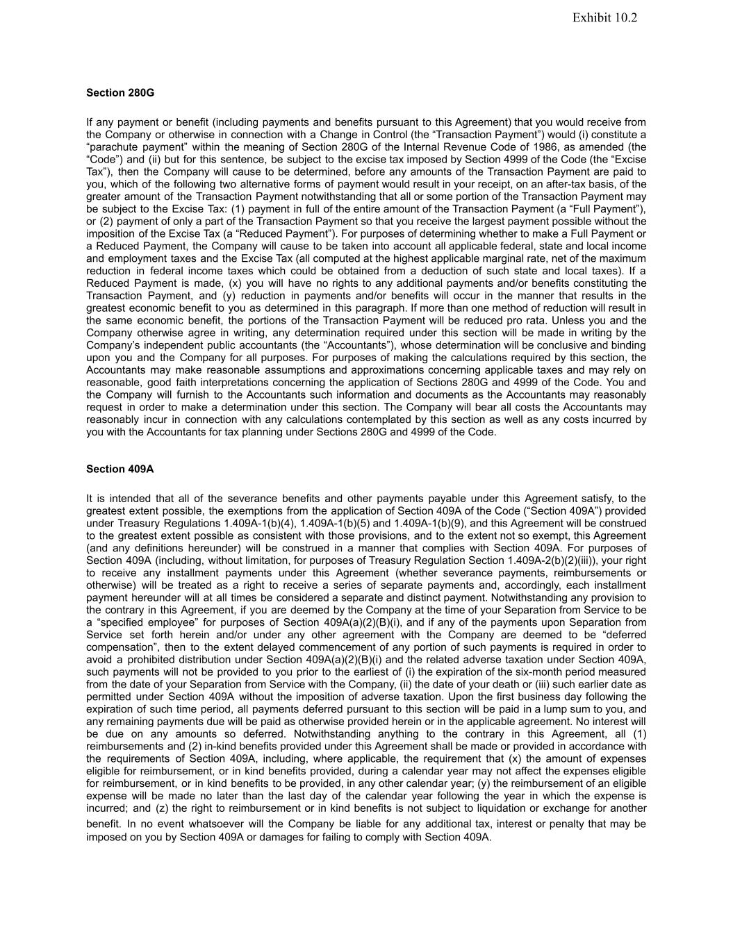 ​Section 280G​ ​If​​any​​payment​​or​​benefit​​(including​​payments​​and​​benefits​​pursuant​​to​​this​​Agreement)​​that​​you​​would​​receive​​from​ ​the​​Company​​or​​otherwise​​in​​connection​​with​​a​​Change​​in​​Control​​(the​​“Transaction​​Payment”)​​would​​(i)​​constitute​​a​ ​“parachute​ ​payment”​ ​within​ ​the​​meaning​​of​​Section​​280G​​of​​the​​Internal​​Revenue​​Code​​of​​1986,​​as​​amended​​(the​ ​“Code”)​​and​​(ii)​​but​​for​​this​​sentence,​​be​​subject​​to​​the​​excise​​tax​​imposed​​by​​Section​​4999​​of​​the​​Code​​(the​​“Excise​ ​Tax”),​ ​then​ ​the​ ​Company​​will​ ​cause​​to​​be​​determined,​​before​​any​​amounts​​of​​the​​Transaction​​Payment​​are​​paid​​to​ ​you,​​which​​of​​the​​following​​two​​alternative​​forms​​of​​payment​​would​​result​​in​​your​​receipt,​​on​​an​​after-tax​​basis,​​of​​the​ ​greater​​amount​​of​​the​​Transaction​​Payment​​notwithstanding​​that​​all​​or​​some​​portion​​of​​the​​Transaction​​Payment​​may​ ​be​​subject​​to​​the​​Excise​​Tax:​​(1)​​payment​​in​​full​ ​of​​the​​entire​​amount​​of​​the​​Transaction​​Payment​​(a​​“Full​​Payment”),​ ​or​​(2)​​payment​​of​​only​​a​​part​​of​​the​​Transaction​​Payment​​so​​that​​you​​receive​​the​​largest​​payment​​possible​​without​​the​ ​imposition​​of​​the​​Excise​​Tax​​(a​​“Reduced​​Payment”).​​For​​purposes​​of​​determining​​whether​​to​​make​​a​​Full​​Payment​​or​ ​a​​Reduced​​Payment,​​the​​Company​​will​ ​cause​​to​​be​​taken​​into​​account​​all​​applicable​​federal,​​state​​and​​local​​income​ ​and​​employment​​taxes​​and​​the​​Excise​​Tax​​(all​​computed​​at​​the​​highest​​applicable​​marginal​​rate,​​net​​of​​the​​maximum​ ​reduction​ ​in​ ​federal​ ​income​ ​taxes​ ​which​ ​could​ ​be​ ​obtained​ ​from​ ​a​ ​deduction​ ​of​ ​such​ ​state​ ​and​ ​local​ ​taxes).​ ​If​ ​a​ ​Reduced​ ​Payment​ ​is​ ​made,​ ​(x)​ ​you​ ​will​ ​have​ ​no​​rights​​to​​any​​additional​​payments​​and/or​​benefits​​constituting​​the​ ​Transaction​ ​Payment,​ ​and​ ​(y)​ ​reduction​ ​in​ ​payments​ ​and/or​ ​benefits​ ​will​ ​occur​ ​in​ ​the​ ​manner​ ​that​ ​results​ ​in​ ​the​ ​greatest​​economic​​benefit​​to​​you​​as​​determined​​in​​this​​paragraph.​​If​​more​​than​​one​​method​​of​​reduction​​will​​result​​in​ ​the​ ​same​ ​economic​ ​benefit,​ ​the​ ​portions​ ​of​​the​​Transaction​​Payment​​will​ ​be​​reduced​​pro​​rata.​​Unless​​you​​and​​the​ ​Company​ ​otherwise​ ​agree​ ​in​ ​writing,​ ​any​ ​determination​ ​required​ ​under​ ​this​ ​section​ ​will​ ​be​​made​​in​​writing​​by​​the​ ​Company’s​​independent​​public​​accountants​​(the​​“Accountants”),​​whose​​determination​​will​​be​​conclusive​​and​​binding​ ​upon​ ​you​ ​and​ ​the​ ​Company​​for​​all​ ​purposes.​​For​​purposes​​of​​making​​the​​calculations​​required​​by​​this​​section,​​the​ ​Accountants​ ​may​ ​make​ ​reasonable​ ​assumptions​​and​​approximations​​concerning​​applicable​​taxes​​and​​may​​rely​​on​ ​reasonable,​ ​good​ ​faith​​interpretations​​concerning​​the​​application​​of​​Sections​​280G​​and​​4999​​of​​the​​Code.​​You​​and​ ​the​ ​Company​ ​will​ ​furnish​ ​to​ ​the​​Accountants​​such​​information​​and​​documents​​as​​the​​Accountants​​may​​reasonably​ ​request​ ​in​​order​​to​​make​​a​​determination​​under​​this​​section.​​The​​Company​​will​ ​bear​​all​ ​costs​​the​​Accountants​​may​ ​reasonably​ ​incur​ ​in​ ​connection​ ​with​​any​​calculations​​contemplated​​by​​this​​section​​as​​well​​as​​any​​costs​​incurred​​by​ ​you with the Accountants for tax planning under Sections 280G and 4999 of the Code.​ ​Section 409A​ ​It​ ​is​ ​intended​ ​that​ ​all​ ​of​ ​the​ ​severance​ ​benefits​ ​and​ ​other​ ​payments​ ​payable​ ​under​ ​this​ ​Agreement​​satisfy,​​to​​the​ ​greatest​​extent​​possible,​​the​​exemptions​​from​​the​​application​​of​​Section​​409A​​of​​the​​Code​​(“Section​​409A”)​​provided​ ​under​​Treasury​​Regulations​​1.409A-1(b)(4),​​1.409A-1(b)(5)​​and​​1.409A-1(b)(9),​​and​​this​​Agreeme