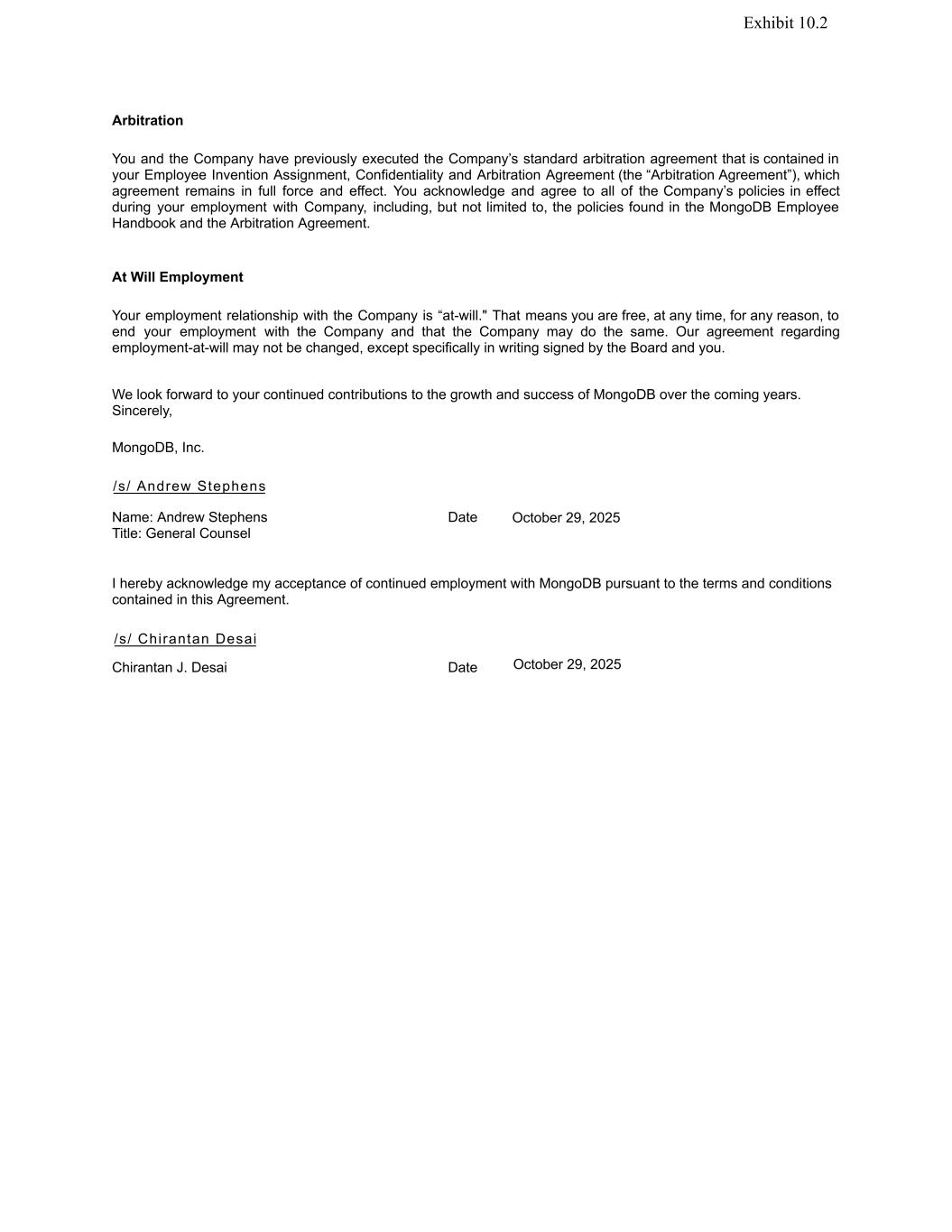 ​Arbitration​ ​You​​and​​the​​Company​​have​​previously​​executed​​the​​Company’s​​standard​​arbitration​​agreement​​that​​is​​contained​​in​ ​your​​Employee​​Invention​​Assignment,​​Confidentiality​​and​​Arbitration​​Agreement​​(the​​“Arbitration​​Agreement”),​​which​ ​agreement​ ​remains​ ​in​ ​full​ ​force​ ​and​ ​effect.​ ​You​ ​acknowledge​ ​and​ ​agree​ ​to​ ​all​ ​of​ ​the​​Company’s​​policies​​in​​effect​ ​during​ ​your​ ​employment​ ​with​ ​Company,​ ​including,​​but​​not​​limited​​to,​​the​​policies​​found​​in​​the​​MongoDB​​Employee​ ​Handbook and the Arbitration Agreement.​ ​At Will Employment​ ​Your​​employment​​relationship​​with​​the​​Company​​is​​“at-will."​​That​​means​​you​​are​​free,​​at​​any​​time,​​for​​any​​reason,​​to​ ​end​ ​your​ ​employment​ ​with​ ​the​ ​Company​ ​and​ ​that​ ​the​ ​Company​ ​may​ ​do​ ​the​ ​same.​ ​Our​ ​agreement​ ​regarding​ ​employment-at-will may not be changed, except specifically in writing signed by the Board and you.​ ​We look forward to your continued contributions to the growth and success of MongoDB over the coming years.​ ​Sincerely,​ ​MongoDB, Inc.​ ​Name: Andrew Stephens​ ​Date​ ​Title: General Counsel​ ​I hereby acknowledge my acceptance of continued employment with MongoDB pursuant to the terms and conditions​ ​contained in this Agreement.​ ​Chirantan J. Desai​ ​Date​ Exhibit 10.2 /s/ Andrew Stephens October 29, 2025 /s/ Chirantan Desai October 29, 2025