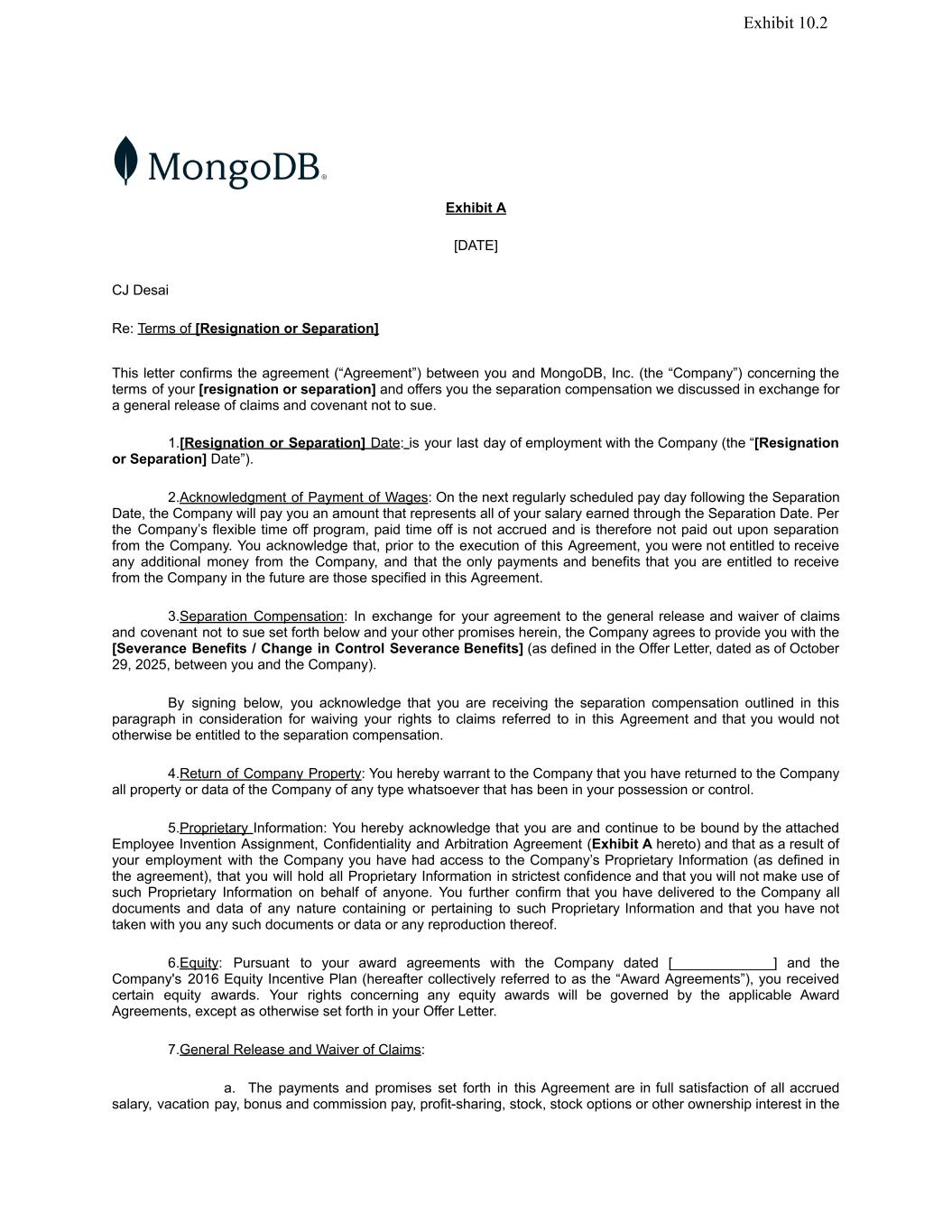 ​Exhibit A​ ​[DATE]​ ​CJ Desai​ ​Re:​​Terms of​​[Resignation or Separation]​ ​This​​letter​​confirms​​the​​agreement​​(“Agreement”)​​between​​you​​and​​MongoDB,​​Inc.​​(the​​“Company”)​​concerning​​the​ ​terms​​of​​your​​[resignation​​or​​separation]​​and​​offers​​you​​the​​separation​​compensation​​we​​discussed​​in​​exchange​​for​ ​a general release of claims and covenant not to sue.​ ​1.​​[​​Resignation​​or​​Separation]​ ​Date​​:​​is​​your​​last​​day​​of​​employment​​with​​the​​Company​​(the​​“​​[Resignation ​or Separation]​​Date”).​ ​2.​​Acknowledgment​​of​​Payment​​of​​Wages​​:​​On​​the​​next​​regularly​​scheduled​​pay​​day​​following​​the​​Separation ​Date,​​the​​Company​​will​​pay​​you​​an​​amount​​that​​represents​​all​​of​​your​​salary​​earned​​through​​the​​Separation​​Date.​​Per​ ​the​ ​Company’s​​flexible​​time​​off​​program,​​paid​​time​​off​​is​​not​​accrued​​and​​is​​therefore​​not​​paid​​out​​upon​​separation​ ​from​​the​​Company.​​You​​acknowledge​​that,​​prior​​to​​the​​execution​​of​​this​​Agreement,​​you​​were​​not​​entitled​​to​​receive​ ​any​ ​additional​ ​money​ ​from​ ​the​ ​Company,​ ​and​ ​that​​the​​only​​payments​​and​​benefits​​that​​you​​are​​entitled​​to​​receive​ ​from the Company in the future are those specified in this Agreement.​ ​3.​​Separation​ ​Compensation​​:​ ​In​ ​exchange​ ​for​ ​your​​agreement​​to​​the​​general​​release​​and​​waiver​​of​​claims ​and​​covenant​​not​​to​​sue​​set​​forth​​below​​and​​your​​other​​promises​​herein,​​the​​Company​​agrees​​to​​provide​​you​​with​​the​ ​[Severance​​Benefits​​/​​Change​​in​​Control​​Severance​​Benefits]​​(as​​defined​​in​​the​​Offer​​Letter,​​dated​​as​​of​​October​ ​29, 2025, between you and the Company).​ ​By​ ​signing​ ​below,​ ​you​ ​acknowledge​ ​that​ ​you​ ​are​ ​receiving​ ​the​ ​separation​ ​compensation​ ​outlined​ ​in​ ​this​ ​paragraph​ ​in​ ​consideration​ ​for​ ​waiving​ ​your​ ​rights​ ​to​ ​claims​ ​referred​ ​to​ ​in​ ​this​ ​Agreement​​and​​that​​you​​would​​not​ ​otherwise be entitled to the separation compensation.​ ​4.​​Return​​of​​Company​​Property​​:​​You​​hereby​​warrant​​to​​the​​Company​​that​​you​​have​​returned​​to​​the​​Company ​all property or data of the Company of any type whatsoever that has been in your possession or control.​ ​5.​​Proprietary​​Information:​​You​​hereby​​acknowledge​​that​​you​​are​​and​​continue​​to​​be​​bound​​by​​the​​attached ​Employee​​Invention​​Assignment,​​Confidentiality​​and​​Arbitration​​Agreement​​(​​Exhibit​​A​​hereto)​​and​​that​​as​​a​​result​​of​ ​your​ ​employment​ ​with​ ​the​​Company​​you​​have​​had​​access​​to​​the​​Company’s​​Proprietary​​Information​​(as​​defined​​in​ ​the​​agreement),​​that​​you​​will​ ​hold​​all​ ​Proprietary​​Information​​in​​strictest​​confidence​​and​​that​​you​​will​​not​​make​​use​​of​ ​such​ ​Proprietary​ ​Information​ ​on​ ​behalf​ ​of​ ​anyone.​ ​You​ ​further​ ​confirm​​that​​you​​have​​delivered​​to​​the​​Company​​all​ ​documents​ ​and​ ​data​ ​of​ ​any​ ​nature​ ​containing​ ​or​ ​pertaining​ ​to​ ​such​​Proprietary​​Information​​and​​that​​you​​have​​not​ ​taken with you any such documents or data or any reproduction thereof.​ ​6.​​Equity​​:​ ​Pursuant​ ​to​ ​your​ ​award​ ​agreements​ ​with​ ​the​ ​Company​ ​dated​ ​[_____________]​ ​and​ ​the ​Company's​ ​2016​​Equity​​Incentive​​Plan​​(hereafter​​collectively​​referred​​to​​as​​the​​“Award​​Agreements”),​​you​​received​ ​certain​ ​equity​ ​awards.​ ​Your​ ​rights​ ​concerning​ ​any​ ​equity​ ​awards​ ​will​ ​be​ ​governed​ ​by​ ​the​ ​applicable​ ​Award​ ​Agreements, except as otherwise set forth in your Offer Letter.​ ​7.​​General Release and Waiver of Claims​​: ​a. ​The​ ​payments​ ​and​ ​promises​ ​set​ ​forth​ ​in​ ​this​​Agreement​​are​​in​​full​ ​satisfaction​​of​​all​ ​accrued ​salary,​​vacation​​pay,​​bonus​​and​​commission​​pay,​​profit-sharing,​​stock,​​stock​​options​​or​​other​​ownership​​interest​​in​​the​ Exhibit 10.2