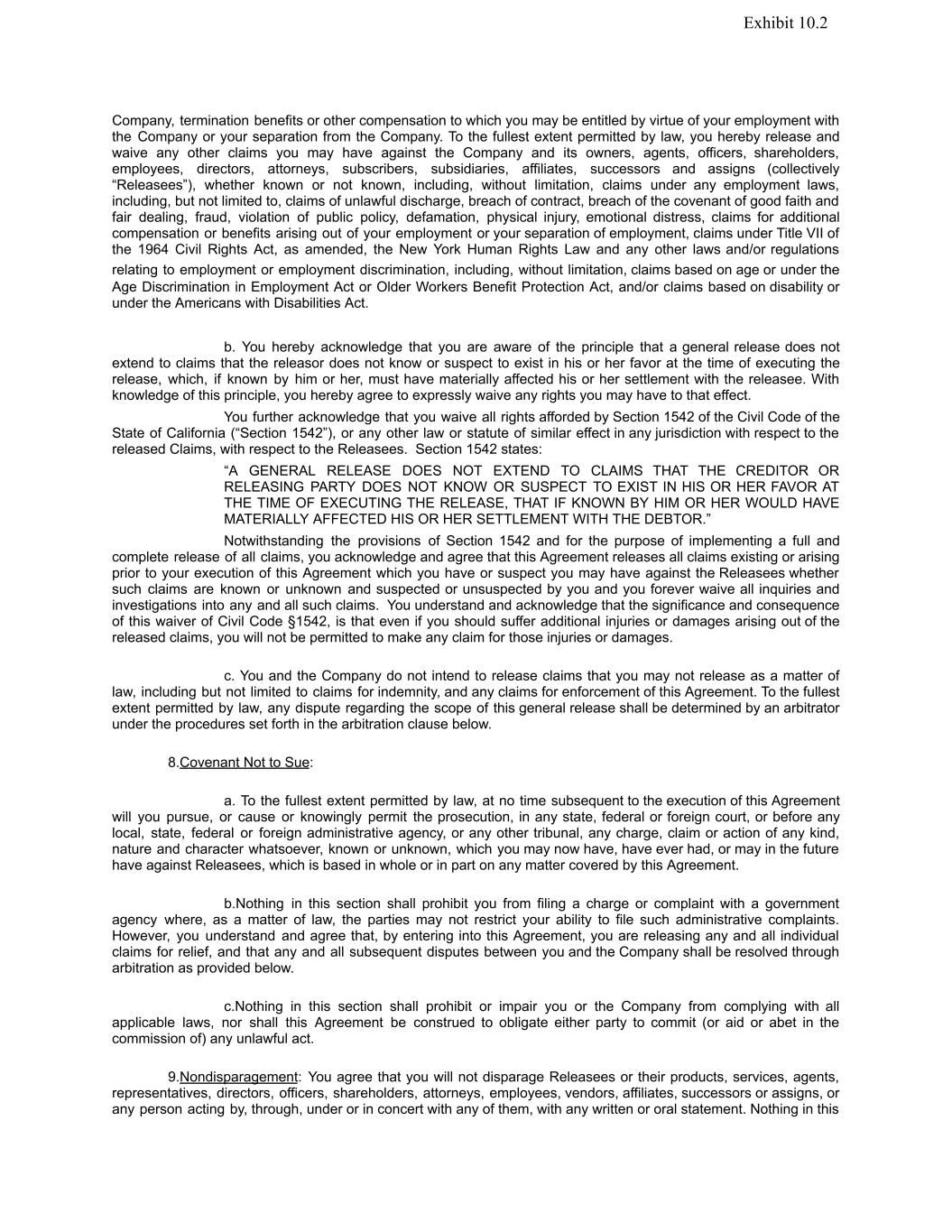 ​Company,​​termination​​benefits​​or​​other​​compensation​​to​​which​​you​​may​​be​​entitled​​by​​virtue​​of​​your​​employment​​with​ ​the​ ​Company​​or​​your​​separation​​from​​the​​Company.​​To​​the​​fullest​​extent​​permitted​​by​​law,​​you​​hereby​​release​​and​ ​waive​ ​any​ ​other​ ​claims​ ​you​ ​may​ ​have​ ​against​ ​the​ ​Company​ ​and​ ​its​ ​owners,​ ​agents,​ ​officers,​ ​shareholders,​ ​employees,​ ​directors,​ ​attorneys,​ ​subscribers,​ ​subsidiaries,​ ​affiliates,​ ​successors​ ​and​ ​assigns​ ​(collectively​ ​“Releasees”),​ ​whether​ ​known​ ​or​ ​not​ ​known,​ ​including,​ ​without​ ​limitation,​ ​claims​ ​under​ ​any​ ​employment​ ​laws,​ ​including,​​but​​not​​limited​​to,​​claims​​of​​unlawful​​discharge,​​breach​​of​​contract,​​breach​​of​​the​​covenant​​of​​good​​faith​​and​ ​fair​ ​dealing,​ ​fraud,​ ​violation​ ​of​ ​public​ ​policy,​ ​defamation,​ ​physical​ ​injury,​ ​emotional​ ​distress,​ ​claims​ ​for​ ​additional​ ​compensation​​or​​benefits​​arising​​out​​of​​your​​employment​​or​​your​​separation​​of​​employment,​​claims​​under​​Title​​VII​​of​ ​the​ ​1964​ ​Civil​ ​Rights​ ​Act,​ ​as​ ​amended,​ ​the​ ​New​ ​York​ ​Human​ ​Rights​ ​Law​ ​and​ ​any​ ​other​ ​laws​​and/or​​regulations​ ​relating​​to​​employment​​or​​employment​​discrimination,​​including,​​without​​limitation,​​claims​​based​​on​​age​​or​​under​​the​ ​Age​​Discrimination​​in​​Employment​​Act​​or​​Older​​Workers​​Benefit​​Protection​​Act,​​and/or​​claims​​based​​on​​disability​​or​ ​under the Americans with Disabilities Act.​ ​b. ​You​ ​hereby​ ​acknowledge​ ​that​ ​you​ ​are​ ​aware​ ​of​ ​the​ ​principle​ ​that​ ​a​​general​​release​​does​​not ​extend​​to​​claims​​that​​the​​releasor​​does​​not​​know​​or​​suspect​​to​​exist​​in​​his​​or​​her​​favor​​at​​the​​time​​of​​executing​​the​ ​release,​ ​which,​ ​if​ ​known​ ​by​ ​him​​or​​her,​​must​​have​​materially​​affected​​his​​or​​her​​settlement​​with​​the​​releasee.​​With​ ​knowledge of this principle, you hereby agree to expressly waive any rights you may have to that effect.​ ​You​​further​​acknowledge​​that​​you​​waive​​all​​rights​​afforded​​by​​Section​​1542​​of​​the​​Civil​​Code​​of​​the​ ​State​​of​​California​​(“Section​​1542”),​​or​​any​​other​​law​​or​​statute​​of​​similar​​effect​​in​​any​​jurisdiction​​with​​respect​​to​​the​ ​released Claims, with respect to the Releasees. Section 1542 states:​ ​“A​ ​GENERAL​ ​RELEASE​ ​DOES​ ​NOT​ ​EXTEND​ ​TO​ ​CLAIMS​ ​THAT​ ​THE​ ​CREDITOR​ ​OR​ ​RELEASING​ ​PARTY​ ​DOES​ ​NOT​ ​KNOW​ ​OR​ ​SUSPECT​ ​TO​​EXIST​​IN​​HIS​​OR​​HER​​FAVOR​​AT​ ​THE​​TIME​​OF​​EXECUTING​​THE​​RELEASE,​​THAT​​IF​​KNOWN​​BY​​HIM​​OR​​HER​​WOULD​​HAVE​ ​MATERIALLY AFFECTED HIS OR HER SETTLEMENT WITH THE DEBTOR.”​ ​Notwithstanding​ ​the​ ​provisions​ ​of​ ​Section​ ​1542​ ​and​ ​for​ ​the​ ​purpose​ ​of​ ​implementing​ ​a​ ​full​ ​and​ ​complete​​release​​of​​all​ ​claims,​​you​​acknowledge​​and​​agree​​that​​this​​Agreement​​releases​​all​​claims​​existing​​or​​arising​ ​prior​​to​​your​​execution​​of​​this​​Agreement​​which​​you​​have​​or​​suspect​​you​​may​​have​​against​​the​​Releasees​​whether​ ​such​ ​claims​ ​are​ ​known​ ​or​ ​unknown​ ​and​​suspected​​or​​unsuspected​​by​​you​​and​​you​​forever​​waive​​all​ ​inquiries​​and​ ​investigations​​into​​any​​and​​all​​such​​claims.​ ​You​​understand​​and​​acknowledge​​that​​the​​significance​​and​​consequence​ ​of​​this​​waiver​​of​​Civil​ ​Code​​§1542,​​is​​that​​even​​if​​you​​should​​suffer​​additional​​injuries​​or​​damages​​arising​​out​​of​​the​ ​released claims, you will not be permitted to make any claim for those injuries or damages.​ ​c. ​You​​and​​the​​Company​​do​​not​​intend​​to​​release​​claims​​that​​you​​may​​not​​release​​as​​a​​matter​​of ​law,​​including​​but​​not​​limited​​to​​claims​​for​​indemnity,​​and​​any​​claims​​for​​enforcement​​of​​this​​Agreement.​​To​​the​​fullest​ ​extent​​permitted​​by​​law,​​any​​dispute​​regarding​​the​​scope​​of​​this​​general​​release​​shall​​be​​determined​​by​