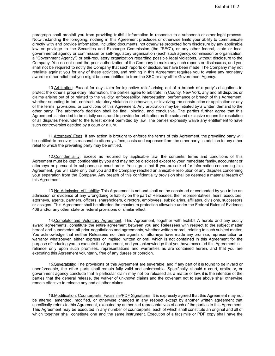 ​paragraph​ ​shall​ ​prohibit​ ​you​ ​from​ ​providing​ ​truthful​ ​information​ ​in​ ​response​ ​to​​a​​subpoena​​or​​other​​legal​​process.​ ​Notwithstanding​ ​the​ ​foregoing,​ ​nothing​ ​in​ ​this​​Agreement​​precludes​​or​​otherwise​​limits​​your​​ability​​to​​communicate​ ​directly​​with​​and​​provide​​information,​​including​​documents,​​not​​otherwise​​protected​​from​​disclosure​​by​​any​​applicable​ ​law​ ​or​ ​privilege​ ​to​ ​the​ ​Securities​ ​and​ ​Exchange​ ​Commission​ ​(the​ ​“SEC”),​ ​or​ ​any​ ​other​ ​federal,​ ​state​ ​or​ ​local​ ​governmental​​agency​​or​​commission​​or​​self-regulatory​​organization​​(each​​such​​agency,​​commission​​or​​organization,​ ​a​​“Government​​Agency”)​​or​​self-regulatory​​organization​​regarding​​possible​​legal​​violations,​​without​​disclosure​​to​​the​ ​Company.​​You​​do​​not​​need​​the​​prior​​authorization​​of​​the​​Company​​to​​make​​any​​such​​reports​​or​​disclosures,​​and​​you​ ​shall​​not​​be​​required​​to​​notify​​the​​Company​​that​​such​​reports​​or​​disclosures​​have​​been​​made.​​The​​Company​​may​​not​ ​retaliate​ ​against​ ​you​ ​for​ ​any​​of​​these​​activities,​​and​​nothing​​in​​this​​Agreement​​requires​​you​​to​​waive​​any​​monetary​ ​award or other relief that you might become entitled to from the SEC or any other Government Agency.​ ​10.​​Arbitration​​:​ ​Except​ ​for​ ​any​ ​claim​ ​for​ ​injunctive​ ​relief​ ​arising​ ​out​ ​of​ ​a​ ​breach​ ​of​ ​a​​party’s​​obligations​​to ​protect​​the​​other’s​​proprietary​​information,​​the​​parties​​agree​​to​​arbitrate,​​in​​County,​​New​​York,​​any​​and​​all​​disputes​​or​ ​claims​​arising​​out​​of​​or​​related​​to​​the​​validity,​​enforceability,​​interpretation,​​performance​​or​​breach​​of​​this​​Agreement,​ ​whether​​sounding​​in​​tort,​​contract,​​statutory​​violation​​or​​otherwise,​​or​​involving​​the​​construction​​or​​application​​or​​any​ ​of​​the​​terms,​​provisions,​​or​​conditions​​of​​this​​Agreement.​​Any​​arbitration​​may​​be​​initiated​​by​​a​​written​​demand​​to​​the​ ​other​ ​party.​ ​The​ ​arbitrator's​ ​decision​ ​shall​ ​be​ ​final,​ ​binding,​ ​and​ ​conclusive.​ ​The​ ​parties​ ​further​ ​agree​ ​that​ ​this​ ​Agreement​​is​​intended​​to​​be​​strictly​​construed​​to​​provide​​for​​arbitration​​as​​the​​sole​​and​​exclusive​​means​​for​​resolution​ ​of​​all​ ​disputes​​hereunder​​to​​the​​fullest​​extent​​permitted​​by​​law.​​The​​parties​​expressly​​waive​​any​​entitlement​​to​​have​ ​such controversies decided by a court or a jury.​ ​11.​​Attorneys’​​Fees​​:​​If​​any​​action​​is​​brought​​to​​enforce​​the​​terms​​of​​this​​Agreement,​​the​​prevailing​​party​​will ​be​​entitled​​to​​recover​​its​​reasonable​​attorneys’​​fees,​​costs​​and​​expenses​​from​​the​​other​​party,​​in​​addition​​to​​any​​other​ ​relief to which the prevailing party may be entitled.​ ​12.​​Confidentiality​​:​ ​Except​ ​as​ ​required​ ​by​ ​applicable​ ​law,​ ​the​ ​contents,​ ​terms​ ​and​ ​conditions​ ​of​ ​this ​Agreement​​must​​be​​kept​​confidential​​by​​you​​and​​may​​not​​be​​disclosed​​except​​to​​your​​immediate​​family,​​accountant​​or​ ​attorneys​ ​or​ ​pursuant​ ​to​ ​subpoena​ ​or​ ​court​ ​order.​ ​You​ ​agree​ ​that​ ​if​ ​you​​are​​asked​​for​​information​​concerning​​this​ ​Agreement,​​you​​will​ ​state​​only​​that​​you​​and​​the​​Company​​reached​​an​​amicable​​resolution​​of​​any​​disputes​​concerning​ ​your​​separation​​from​​the​​Company.​​Any​​breach​​of​​this​​confidentiality​​provision​​shall​​be​​deemed​​a​​material​​breach​​of​ ​this Agreement.​ ​13.​​No​​Admission​​of​​Liability​​:​​This​​Agreement​​is​​not​​and​​shall​​not​​be​​construed​​or​​contended​​by​​you​​to​​be​​an ​admission​​or​​evidence​​of​​any​​wrongdoing​​or​​liability​​on​​the​​part​​of​​Releasees,​​their​​representatives,​​heirs,​​executors,​ ​attorneys,​​agents,​​partners,​​officers,​​shareholders,​​directors,​​employees,​​subsidiaries,​​affiliates,​​divisions,​​successors​ ​or​​assigns.​​This​​Agreement​​shall​​be​​afforded​​the​​maximum​