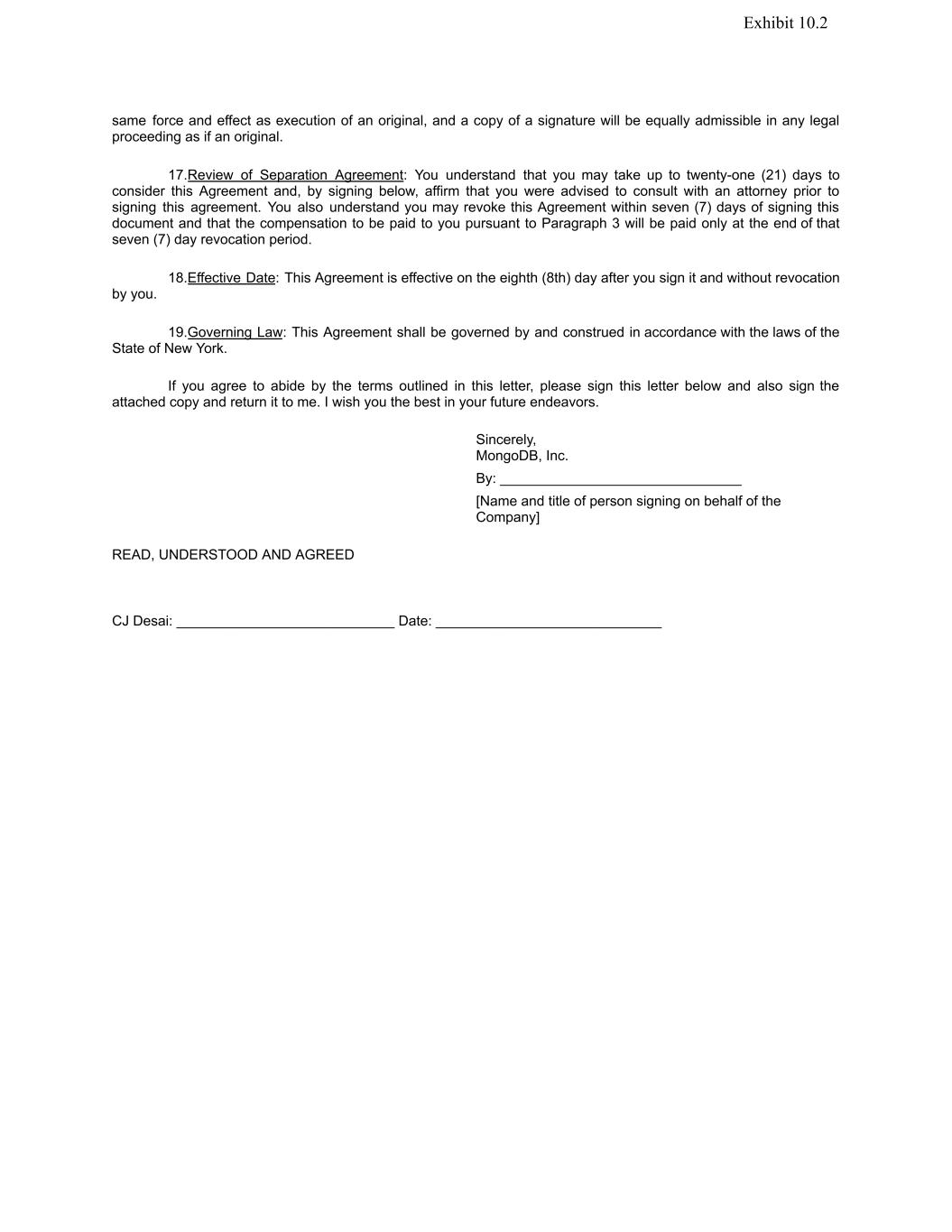 ​same​ ​force​​and​​effect​​as​​execution​​of​​an​​original,​​and​​a​​copy​​of​​a​​signature​​will​ ​be​​equally​​admissible​​in​​any​​legal​ ​proceeding as if an original.​ ​17.​​Review​ ​of​ ​Separation​ ​Agreement​​:​ ​You​ ​understand​ ​that​ ​you​ ​may​ ​take​ ​up​ ​to​ ​twenty-one​ ​(21)​ ​days​ ​to ​consider​ ​this​ ​Agreement​ ​and,​ ​by​ ​signing​ ​below,​ ​affirm​ ​that​ ​you​ ​were​ ​advised​ ​to​ ​consult​ ​with​ ​an​ ​attorney​ ​prior​ ​to​ ​signing​ ​this​ ​agreement.​ ​You​ ​also​ ​understand​​you​​may​​revoke​​this​​Agreement​​within​​seven​​(7)​​days​​of​​signing​​this​ ​document​​and​​that​​the​​compensation​​to​​be​​paid​​to​​you​​pursuant​​to​​Paragraph​​3​​will​ ​be​​paid​​only​​at​​the​​end​​of​​that​ ​seven (7) day revocation period.​ ​18.​​Effective​​Date​​:​​This​​Agreement​​is​​effective​​on​​the​​eighth​​(8th)​​day​​after​​you​​sign​​it​​and​​without​​revocation ​by you.​ ​19.​​Governing​​Law​​:​​This​​Agreement​​shall​​be​​governed​​by​​and​​construed​​in​​accordance​​with​​the​​laws​​of​​the ​State of New York.​ ​If​ ​you​ ​agree​ ​to​ ​abide​ ​by​ ​the​ ​terms​ ​outlined​ ​in​ ​this​ ​letter,​ ​please​ ​sign​ ​this​ ​letter​ ​below​ ​and​ ​also​ ​sign​​the​ ​attached copy and return it to me. I wish you the best in your future endeavors.​ ​Sincerely,​ ​MongoDB, Inc.​ ​By: _______________________________​ ​[Name and title of person signing on behalf of the​ ​Company]​ ​READ, UNDERSTOOD AND AGREED​ ​CJ Desai: ____________________________ Date: _____________________________​ Exhibit 10.2