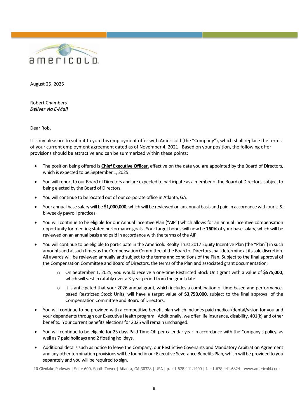 10 Glenlake Parkway | Suite 600, South Tower | Atlanta, GA 30328 | USA | p. +1.678.441.1400 | f. +1.678.441.6824 | www.americold.com August 25, 2025 Robert Chambers Deliver via E-Mail Dear Rob, It is my pleasure to submit to you this employment offer with Americold (the “Company”), which shall replace the terms of your current employment agreement dated as of November 4, 2021. Based on your position, the following offer provisions should be attractive and can be summarized within these points: • The position being offered is Chief Executive Officer, effective on the date you are appointed by the Board of Directors, which is expected to be September 1, 2025. • You will report to our Board of Directors and are expected to participate as a member of the Board of Directors, subject to being elected by the Board of Directors. • You will continue to be located out of our corporate office in Atlanta, GA. • Your annual base salary will be $1,000,000, which will be reviewed on an annual basis and paid in accordance with our U.S. bi-weekly payroll practices. • You will continue to be eligible for our Annual Incentive Plan (“AIP”) which allows for an annual incentive compensation opportunity for meeting stated performance goals. Your target bonus will now be 160% of your base salary, which will be reviewed on an annual basis and paid in accordance with the terms of the AIP. • You will continue to be eligible to participate in the Americold Realty Trust 2017 Equity Incentive Plan (the “Plan”) in such amounts and at such times as the Compensation Committee of the Board of Directors shall determine at its sole discretion. All awards will be reviewed annually and subject to the terms and conditions of the Plan. Subject to the final approval of the Compensation Committee and Board of Directors, the terms of the Plan and associated grant documentation: o On September 1, 2025, you would receive a one-time Restricted Stock Unit grant with a value of $575,000, which will vest in ratably over a 3-year period from the grant date. o It is anticipated that your 2026 annual grant, which includes a combination of time-based and performance- based Restricted Stock Units, will have a target value of $3,750,000, subject to the final approval of the Compensation Committee and Board of Directors. • You will continue to be provided with a competitive benefit plan which includes paid medical/dental/vision for you and your dependents through our Executive Health program. Additionally, we offer life insurance, disability, 401(k) and other benefits. Your current benefits elections for 2025 will remain unchanged. • You will continue to be eligible for 25 days Paid Time Off per calendar year in accordance with the Company’s policy, as well as 7 paid holidays and 2 floating holidays. • Additional details such as notice to leave the Company, our Restrictive Covenants and Mandatory Arbitration Agreement and any other termination provisions will be found in our Executive Severance Benefits Plan, which will be provided to you separately and you will be required to sign. 6