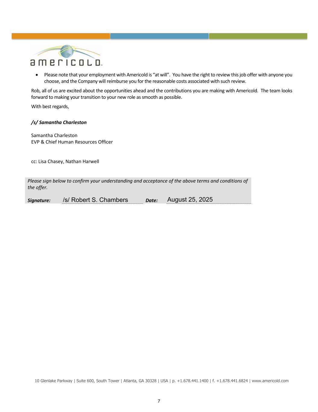 10 Glenlake Parkway | Suite 600, South Tower | Atlanta, GA 30328 | USA | p. +1.678.441.1400 | f. +1.678.441.6824 | www.americold.com • Please note that your employment with Americold is “at will”. You have the right to review this job offer with anyone you choose, and the Company will reimburse you for the reasonable costs associated with such review. Rob, all of us are excited about the opportunities ahead and the contributions you are making with Americold. The team looks forward to making your transition to your new role as smooth as possible. With best regards, /s/ Samantha Charleston Samantha Charleston EVP & Chief Human Resources Officer cc: Lisa Chasey, Nathan Harwell Please sign below to confirm your understanding and acceptance of the above terms and conditions of the offer. Signature: Date: 7 /s/ Robert S. Chambers August 25, 2025
