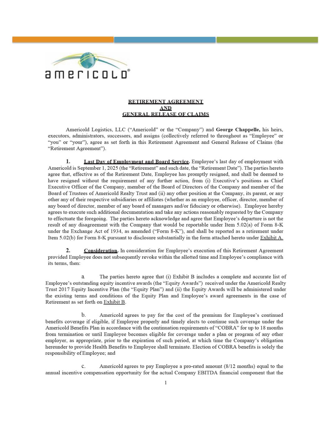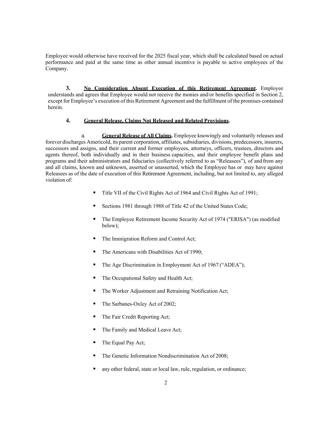 2 Employee would otherwise have received for the 2025 fiscal year, which shall be calculated based on actual performance and paid at the same time as other annual incentive is payable to active employees of the Company. 3. No Consideration Absent Execution of this Retirement Agreement. Employee understands and agrees that Employee would not receive the monies and/or benefits specified in Section 2, except for Employee’s execution of this Retirement Agreement and the fulfillment of the promises contained herein. 4. General Release, Claims Not Released and Related Provisions. a. General Release of All Claims. Employee knowingly and voluntarily releases and forever discharges Americold, its parent corporation, affiliates, subsidiaries, divisions, predecessors, insurers, successors and assigns, and their current and former employees, attorneys, officers, trustees, directors and agents thereof, both individually and in their business capacities, and their employee benefit plans and programs and their administrators and fiduciaries (collectively referred to as “Releasees”), of and from any and all claims, known and unknown, asserted or unasserted, which the Employee has or may have against Releasees as of the date of execution of this Retirement Agreement, including, but not limited to, any alleged violation of:  Title VII of the Civil Rights Act of 1964 and Civil Rights Act of 1991;  Sections 1981 through 1988 of Title 42 of the United States Code;  The Employee Retirement Income Security Act of 1974 ("ERISA") (as modified below);  The Immigration Reform and Control Act;  The Americans with Disabilities Act of 1990;  The Age Discrimination in Employment Act of 1967 (“ADEA”);  The Occupational Safety and Health Act;  The Worker Adjustment and Retraining Notification Act;  The Sarbanes-Oxley Act of 2002;  The Fair Credit Reporting Act;  The Family and Medical Leave Act;  The Equal Pay Act;  The Genetic Information Nondiscrimination Act of 2008;  any other federal, state or local law, rule, regulation, or ordinance;