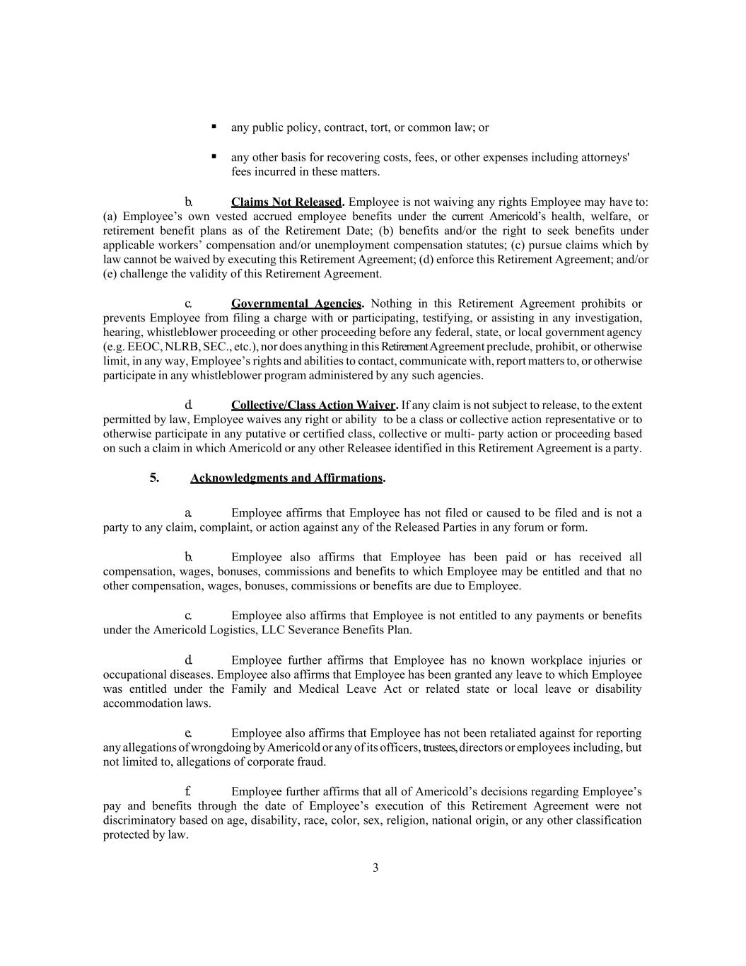 3  any public policy, contract, tort, or common law; or  any other basis for recovering costs, fees, or other expenses including attorneys' fees incurred in these matters. b. Claims Not Released. Employee is not waiving any rights Employee may have to: (a) Employee’s own vested accrued employee benefits under the current Americold’s health, welfare, or retirement benefit plans as of the Retirement Date; (b) benefits and/or the right to seek benefits under applicable workers’ compensation and/or unemployment compensation statutes; (c) pursue claims which by law cannot be waived by executing this Retirement Agreement; (d) enforce this Retirement Agreement; and/or (e) challenge the validity of this Retirement Agreement. c. Governmental Agencies. Nothing in this Retirement Agreement prohibits or prevents Employee from filing a charge with or participating, testifying, or assisting in any investigation, hearing, whistleblower proceeding or other proceeding before any federal, state, or local government agency (e.g. EEOC, NLRB, SEC., etc.), nor does anything in this Retirement Agreement preclude, prohibit, or otherwise limit, in any way, Employee’s rights and abilities to contact, communicate with, report matters to, or otherwise participate in any whistleblower program administered by any such agencies. d. Collective/Class Action Waiver. If any claim is not subject to release, to the extent permitted by law, Employee waives any right or ability to be a class or collective action representative or to otherwise participate in any putative or certified class, collective or multi- party action or proceeding based on such a claim in which Americold or any other Releasee identified in this Retirement Agreement is a party. 5. Acknowledgments and Affirmations. a. Employee affirms that Employee has not filed or caused to be filed and is not a party to any claim, complaint, or action against any of the Released Parties in any forum or form. b. Employee also affirms that Employee has been paid or has received all compensation, wages, bonuses, commissions and benefits to which Employee may be entitled and that no other compensation, wages, bonuses, commissions or benefits are due to Employee. c. Employee also affirms that Employee is not entitled to any payments or benefits under the Americold Logistics, LLC Severance Benefits Plan. d. Employee further affirms that Employee has no known workplace injuries or occupational diseases. Employee also affirms that Employee has been granted any leave to which Employee was entitled under the Family and Medical Leave Act or related state or local leave or disability accommodation laws. e. Employee also affirms that Employee has not been retaliated against for reporting any allegations of wrongdoing by Americold or any of its officers, trustees, directors or employees including, but not limited to, allegations of corporate fraud. f. Employee further affirms that all of Americold’s decisions regarding Employee’s pay and benefits through the date of Employee’s execution of this Retirement Agreement were not discriminatory based on age, disability, race, color, sex, religion, national origin, or any other classification protected by law.