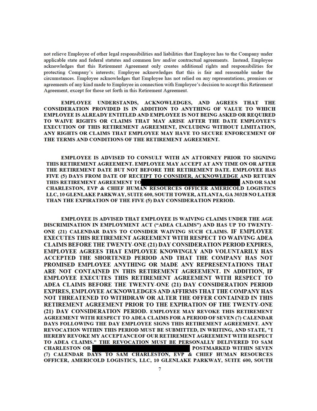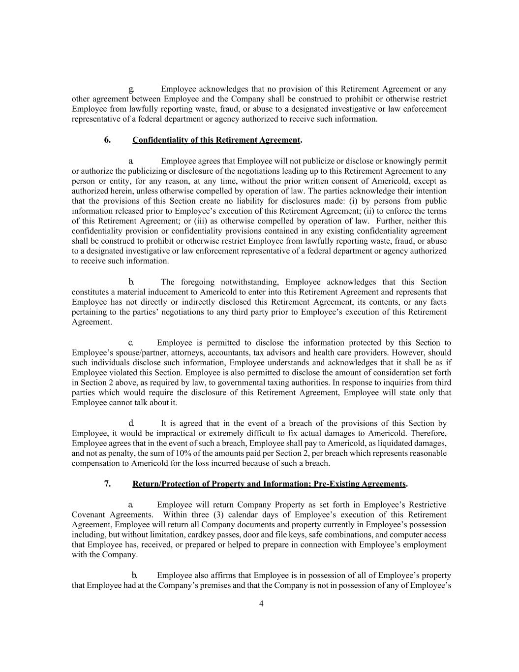 4 g. Employee acknowledges that no provision of this Retirement Agreement or any other agreement between Employee and the Company shall be construed to prohibit or otherwise restrict Employee from lawfully reporting waste, fraud, or abuse to a designated investigative or law enforcement representative of a federal department or agency authorized to receive such information. 6. Confidentiality of this Retirement Agreement. a. Employee agrees that Employee will not publicize or disclose or knowingly permit or authorize the publicizing or disclosure of the negotiations leading up to this Retirement Agreement to any person or entity, for any reason, at any time, without the prior written consent of Americold, except as authorized herein, unless otherwise compelled by operation of law. The parties acknowledge their intention that the provisions of this Section create no liability for disclosures made: (i) by persons from public information released prior to Employee’s execution of this Retirement Agreement; (ii) to enforce the terms of this Retirement Agreement; or (iii) as otherwise compelled by operation of law. Further, neither this confidentiality provision or confidentiality provisions contained in any existing confidentiality agreement shall be construed to prohibit or otherwise restrict Employee from lawfully reporting waste, fraud, or abuse to a designated investigative or law enforcement representative of a federal department or agency authorized to receive such information. b. The foregoing notwithstanding, Employee acknowledges that this Section constitutes a material inducement to Americold to enter into this Retirement Agreement and represents that Employee has not directly or indirectly disclosed this Retirement Agreement, its contents, or any facts pertaining to the parties’ negotiations to any third party prior to Employee’s execution of this Retirement Agreement. c. Employee is permitted to disclose the information protected by this Section to Employee’s spouse/partner, attorneys, accountants, tax advisors and health care providers. However, should such individuals disclose such information, Employee understands and acknowledges that it shall be as if Employee violated this Section. Employee is also permitted to disclose the amount of consideration set forth in Section 2 above, as required by law, to governmental taxing authorities. In response to inquiries from third parties which would require the disclosure of this Retirement Agreement, Employee will state only that Employee cannot talk about it. d. It is agreed that in the event of a breach of the provisions of this Section by Employee, it would be impractical or extremely difficult to fix actual damages to Americold. Therefore, Employee agrees that in the event of such a breach, Employee shall pay to Americold, as liquidated damages, and not as penalty, the sum of 10% of the amounts paid per Section 2, per breach which represents reasonable compensation to Americold for the loss incurred because of such a breach. 7. Return/Protection of Property and Information; Pre-Existing Agreements. a. Employee will return Company Property as set forth in Employee’s Restrictive Covenant Agreements. Within three (3) calendar days of Employee’s execution of this Retirement Agreement, Employee will return all Company documents and property currently in Employee’s possession including, but without limitation, cardkey passes, door and file keys, safe combinations, and computer access that Employee has, received, or prepared or helped to prepare in connection with Employee’s employment with the Company. b. Employee also affirms that Employee is in possession of all of Employee’s property that Employee had at the Company’s premises and that the Company is not in possession of any of Employee’s