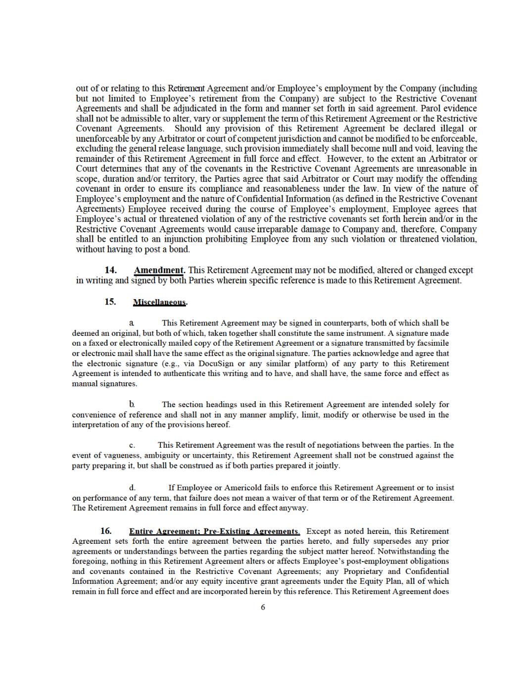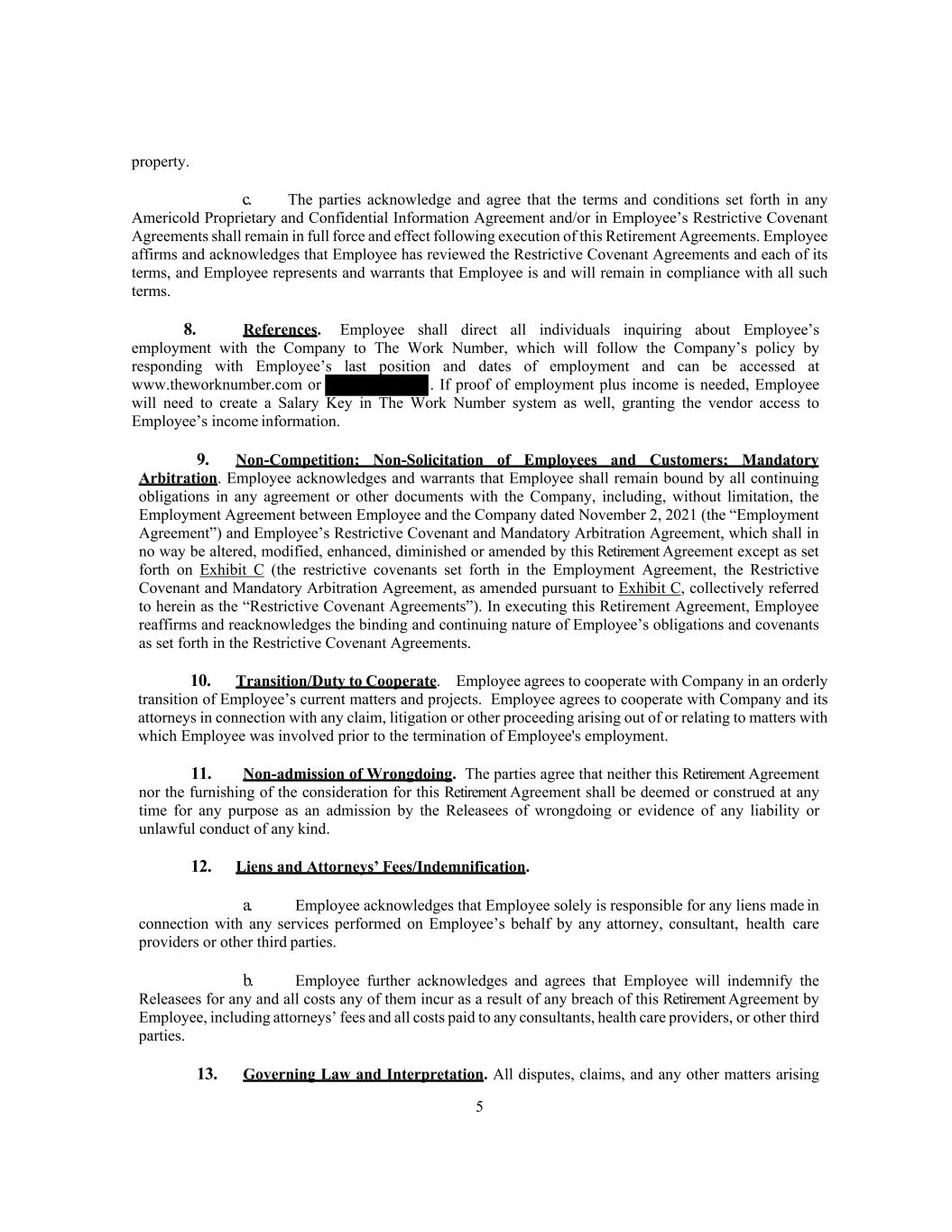 5 property. c. The parties acknowledge and agree that the terms and conditions set forth in any Americold Proprietary and Confidential Information Agreement and/or in Employee’s Restrictive Covenant Agreements shall remain in full force and effect following execution of this Retirement Agreements. Employee affirms and acknowledges that Employee has reviewed the Restrictive Covenant Agreements and each of its terms, and Employee represents and warrants that Employee is and will remain in compliance with all such terms. 8. References. Employee shall direct all individuals inquiring about Employee’s employment with the Company to The Work Number, which will follow the Company’s policy by responding with Employee’s last position and dates of employment and can be accessed at www.theworknumber.com or . If proof of employment plus income is needed, Employee will need to create a Salary Key in The Work Number system as well, granting the vendor access to Employee’s income information. 9. Non-Competition; Non-Solicitation of Employees and Customers; Mandatory Arbitration. Employee acknowledges and warrants that Employee shall remain bound by all continuing obligations in any agreement or other documents with the Company, including, without limitation, the Employment Agreement between Employee and the Company dated November 2, 2021 (the “Employment Agreement”) and Employee’s Restrictive Covenant and Mandatory Arbitration Agreement, which shall in no way be altered, modified, enhanced, diminished or amended by this Retirement Agreement except as set forth on Exhibit C (the restrictive covenants set forth in the Employment Agreement, the Restrictive Covenant and Mandatory Arbitration Agreement, as amended pursuant to Exhibit C, collectively referred to herein as the “Restrictive Covenant Agreements”). In executing this Retirement Agreement, Employee reaffirms and reacknowledges the binding and continuing nature of Employee’s obligations and covenants as set forth in the Restrictive Covenant Agreements. 10. Transition/Duty to Cooperate. Employee agrees to cooperate with Company in an orderly transition of Employee’s current matters and projects. Employee agrees to cooperate with Company and its attorneys in connection with any claim, litigation or other proceeding arising out of or relating to matters with which Employee was involved prior to the termination of Employee's employment. 11. Non-admission of Wrongdoing. The parties agree that neither this Retirement Agreement nor the furnishing of the consideration for this Retirement Agreement shall be deemed or construed at any time for any purpose as an admission by the Releasees of wrongdoing or evidence of any liability or unlawful conduct of any kind. 12. Liens and Attorneys’ Fees/Indemnification. a. Employee acknowledges that Employee solely is responsible for any liens made in connection with any services performed on Employee’s behalf by any attorney, consultant, health care providers or other third parties. b. Employee further acknowledges and agrees that Employee will indemnify the Releasees for any and all costs any of them incur as a result of any breach of this Retirement Agreement by Employee, including attorneys’ fees and all costs paid to any consultants, health care providers, or other third parties. 13. Governing Law and Interpretation. All disputes, claims, and any other matters arising