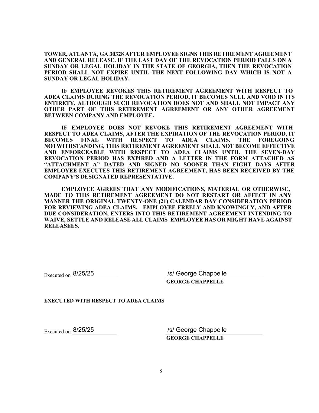 8 Executed on _________________ ____________________________________ GEORGE CHAPPELLE EXECUTED WITH RESPECT TO ADEA CLAIMS Executed on _________________ ____________________________________ GEORGE CHAPPELLE TOWER, ATLANTA, GA 30328 AFTER EMPLOYEE SIGNS THIS RETIREMENT AGREEMENT AND GENERAL RELEASE. IF THE LAST DAY OF THE REVOCATION PERIOD FALLS ON A SUNDAY OR LEGAL HOLIDAY IN THE STATE OF GEORGIA, THEN THE REVOCATION PERIOD SHALL NOT EXPIRE UNTIL THE NEXT FOLLOWING DAY WHICH IS NOT A SUNDAY OR LEGAL HOLIDAY. IF EMPLOYEE REVOKES THIS RETIREMENT AGREEMENT WITH RESPECT TO ADEA CLAIMS DURING THE REVOCATION PERIOD, IT BECOMES NULL AND VOID IN ITS ENTIRETY, ALTHOUGH SUCH REVOCATION DOES NOT AND SHALL NOT IMPACT ANY OTHER PART OF THIS RETIREMENT AGREEMENT OR ANY OTHER AGREEMENT BETWEEN COMPANY AND EMPLOYEE. IF EMPLOYEE DOES NOT REVOKE THIS RETIREMENT AGREEMENT WITH RESPECT TO ADEA CLAIMS, AFTER THE EXPIRATION OF THE REVOCATION PERIOD, IT BECOMES FINAL WITH RESPECT TO ADEA CLAIMS. THE FOREGOING NOTWITHSTANDING, THIS RETIREMENT AGREEMENT SHALL NOT BECOME EFFECTIVE AND ENFORCEABLE WITH RESPECT TO ADEA CLAIMS UNTIL THE SEVEN-DAY REVOCATION PERIOD HAS EXPIRED AND A LETTER IN THE FORM ATTACHED AS “ATTACHMENT A” DATED AND SIGNED NO SOONER THAN EIGHT DAYS AFTER EMPLOYEE EXECUTES THIS RETIREMENT AGREEMENT, HAS BEEN RECEIVED BY THE COMPANY’S DESIGNATED REPRESENTATIVE. EMPLOYEE AGREES THAT ANY MODIFICATIONS, MATERIAL OR OTHERWISE, MADE TO THIS RETIREMENT AGREEMENT DO NOT RESTART OR AFFECT IN ANY MANNER THE ORIGINAL TWENTY-ONE (21) CALENDAR DAY CONSIDERATION PERIOD FOR REVIEWING ADEA CLAIMS. EMPLOYEE FREELY AND KNOWINGLY, AND AFTER DUE CONSIDERATION, ENTERS INTO THIS RETIREMENT AGREEMENT INTENDING TO WAIVE, SETTLE AND RELEASE ALL CLAIMS EMPLOYEE HAS OR MIGHT HAVE AGAINST RELEASEES. 8/25/25 8/25/25 /s/ George Chappelle /s/ George Chappelle