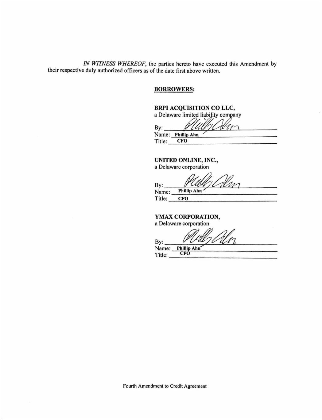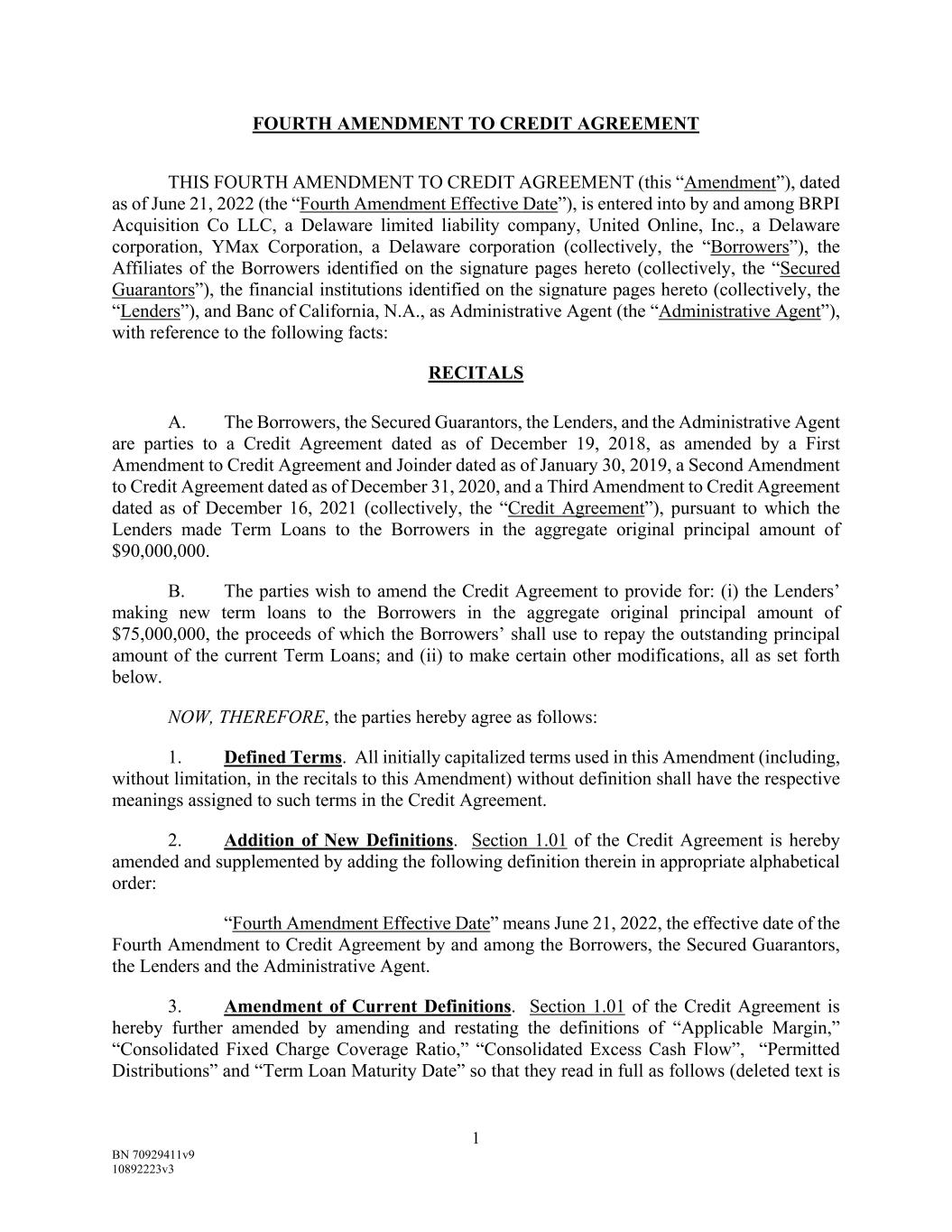 1 BN 70929411v9 10892223v3 FOURTH AMENDMENT TO CREDIT AGREEMENT THIS FOURTH AMENDMENT TO CREDIT AGREEMENT (this “Amendment”), dated as of June 21, 2022 (the “Fourth Amendment Effective Date”), is entered into by and among BRPI Acquisition Co LLC, a Delaware limited liability company, United Online, Inc., a Delaware corporation, YMax Corporation, a Delaware corporation (collectively, the “Borrowers”), the Affiliates of the Borrowers identified on the signature pages hereto (collectively, the “Secured Guarantors”), the financial institutions identified on the signature pages hereto (collectively, the “Lenders”), and Banc of California, N.A., as Administrative Agent (the “Administrative Agent”), with reference to the following facts: RECITALS A. The Borrowers, the Secured Guarantors, the Lenders, and the Administrative Agent are parties to a Credit Agreement dated as of December 19, 2018, as amended by a First Amendment to Credit Agreement and Joinder dated as of January 30, 2019, a Second Amendment to Credit Agreement dated as of December 31, 2020, and a Third Amendment to Credit Agreement dated as of December 16, 2021 (collectively, the “Credit Agreement”), pursuant to which the Lenders made Term Loans to the Borrowers in the aggregate original principal amount of $90,000,000. B. The parties wish to amend the Credit Agreement to provide for: (i) the Lenders’ making new term loans to the Borrowers in the aggregate original principal amount of $75,000,000, the proceeds of which the Borrowers’ shall use to repay the outstanding principal amount of the current Term Loans; and (ii) to make certain other modifications, all as set forth below. NOW, THEREFORE, the parties hereby agree as follows: 1. Defined Terms. All initially capitalized terms used in this Amendment (including, without limitation, in the recitals to this Amendment) without definition shall have the respective meanings assigned to such terms in the Credit Agreement. 2. Addition of New Definitions. Section 1.01 of the Credit Agreement is hereby amended and supplemented by adding the following definition therein in appropriate alphabetical order: “Fourth Amendment Effective Date” means June 21, 2022, the effective date of the Fourth Amendment to Credit Agreement by and among the Borrowers, the Secured Guarantors, the Lenders and the Administrative Agent. 3. Amendment of Current Definitions. Section 1.01 of the Credit Agreement is hereby further amended by amending and restating the definitions of “Applicable Margin,” “Consolidated Fixed Charge Coverage Ratio,” “Consolidated Excess Cash Flow”, “Permitted Distributions” and “Term Loan Maturity Date” so that they read in full as follows (deleted text is