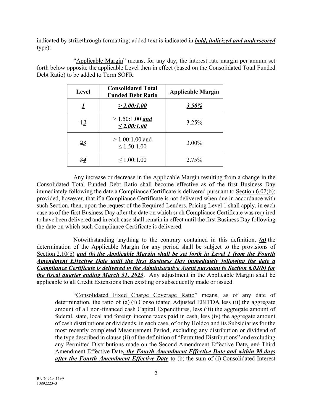 2 BN 70929411v9 10892223v3 indicated by strikethrough formatting; added text is indicated in bold, italicized and underscored type): “Applicable Margin” means, for any day, the interest rate margin per annum set forth below opposite the applicable Level then in effect (based on the Consolidated Total Funded Debt Ratio) to be added to Term SOFR: Level Consolidated Total Funded Debt Ratio Applicable Margin 1 ˃ 2.00:1.00 3.50% 12 ˃ 1.50:1.00 and ≤ 2.00:1.00 3.25% 23 > 1.00:1.00 and ≤ 1.50:1.00 3.00% 34 ≤ 1.00:1.00 2.75% Any increase or decrease in the Applicable Margin resulting from a change in the Consolidated Total Funded Debt Ratio shall become effective as of the first Business Day immediately following the date a Compliance Certificate is delivered pursuant to Section 6.02(b); provided, however, that if a Compliance Certificate is not delivered when due in accordance with such Section, then, upon the request of the Required Lenders, Pricing Level 1 shall apply, in each case as of the first Business Day after the date on which such Compliance Certificate was required to have been delivered and in each case shall remain in effect until the first Business Day following the date on which such Compliance Certificate is delivered. Notwithstanding anything to the contrary contained in this definition, (a) the determination of the Applicable Margin for any period shall be subject to the provisions of Section 2.10(b) and (b) the Applicable Margin shall be set forth in Level 1 from the Fourth Amendment Effective Date until the first Business Day immediately following the date a Compliance Certificate is delivered to the Administrative Agent pursuant to Section 6.02(b) for the fiscal quarter ending March 31, 2023. Any adjustment in the Applicable Margin shall be applicable to all Credit Extensions then existing or subsequently made or issued. “Consolidated Fixed Charge Coverage Ratio” means, as of any date of determination, the ratio of (a) (i) Consolidated Adjusted EBITDA less (ii) the aggregate amount of all non-financed cash Capital Expenditures, less (iii) the aggregate amount of federal, state, local and foreign income taxes paid in cash, less (iv) the aggregate amount of cash distributions or dividends, in each case, of or by Holdco and its Subsidiaries for the most recently completed Measurement Period, excluding any distribution or dividend of the type described in clause (ii) of the definition of “Permitted Distributions” and excluding any Permitted Distributions made on the Second Amendment Effective Date, and Third Amendment Effective Date, the Fourth Amendment Effective Date and within 90 days after the Fourth Amendment Effective Date to (b) the sum of (i) Consolidated Interest
