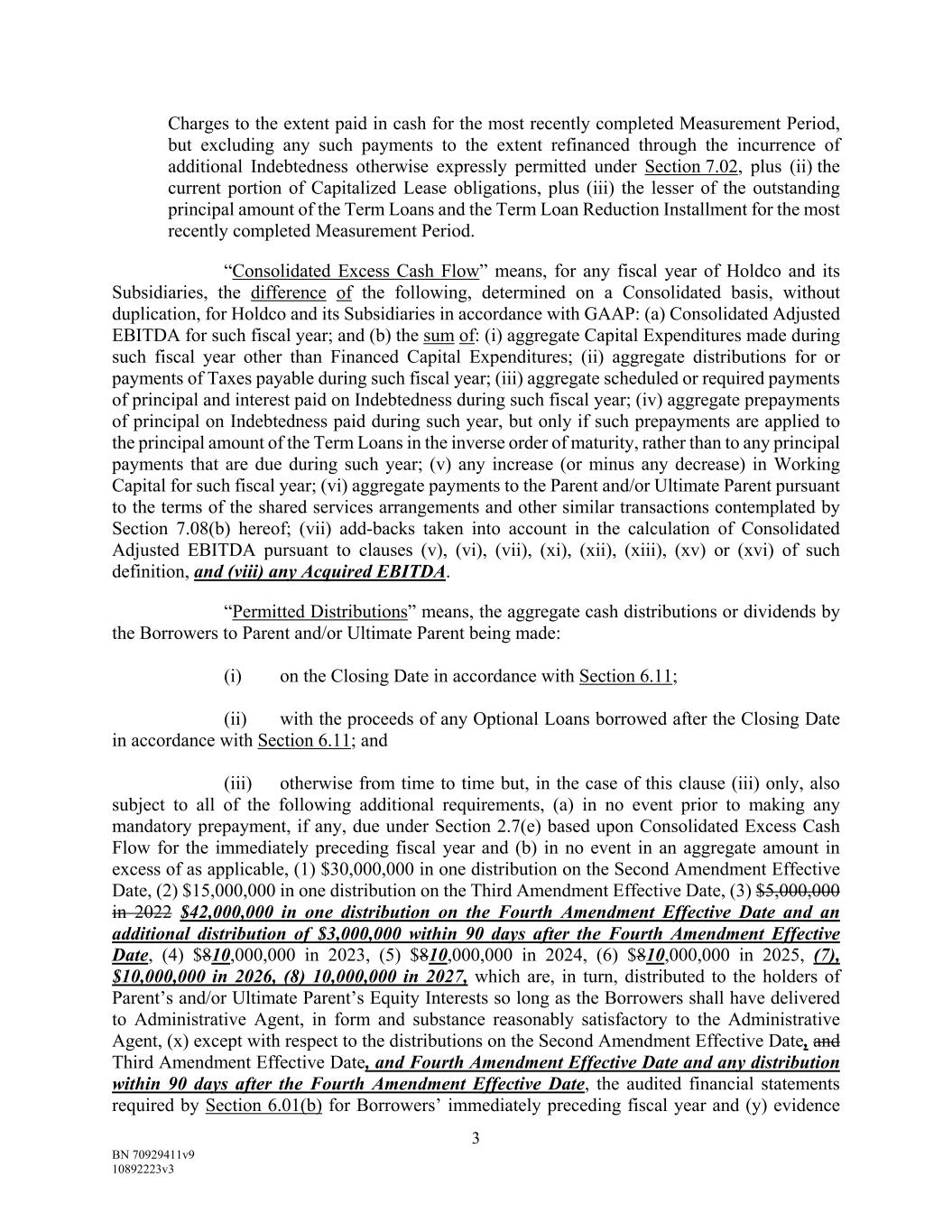 3 BN 70929411v9 10892223v3 Charges to the extent paid in cash for the most recently completed Measurement Period, but excluding any such payments to the extent refinanced through the incurrence of additional Indebtedness otherwise expressly permitted under Section 7.02, plus (ii) the current portion of Capitalized Lease obligations, plus (iii) the lesser of the outstanding principal amount of the Term Loans and the Term Loan Reduction Installment for the most recently completed Measurement Period. “Consolidated Excess Cash Flow” means, for any fiscal year of Holdco and its Subsidiaries, the difference of the following, determined on a Consolidated basis, without duplication, for Holdco and its Subsidiaries in accordance with GAAP: (a) Consolidated Adjusted EBITDA for such fiscal year; and (b) the sum of: (i) aggregate Capital Expenditures made during such fiscal year other than Financed Capital Expenditures; (ii) aggregate distributions for or payments of Taxes payable during such fiscal year; (iii) aggregate scheduled or required payments of principal and interest paid on Indebtedness during such fiscal year; (iv) aggregate prepayments of principal on Indebtedness paid during such year, but only if such prepayments are applied to the principal amount of the Term Loans in the inverse order of maturity, rather than to any principal payments that are due during such year; (v) any increase (or minus any decrease) in Working Capital for such fiscal year; (vi) aggregate payments to the Parent and/or Ultimate Parent pursuant to the terms of the shared services arrangements and other similar transactions contemplated by Section 7.08(b) hereof; (vii) add-backs taken into account in the calculation of Consolidated Adjusted EBITDA pursuant to clauses (v), (vi), (vii), (xi), (xii), (xiii), (xv) or (xvi) of such definition, and (viii) any Acquired EBITDA. “Permitted Distributions” means, the aggregate cash distributions or dividends by the Borrowers to Parent and/or Ultimate Parent being made: (i) on the Closing Date in accordance with Section 6.11; (ii) with the proceeds of any Optional Loans borrowed after the Closing Date in accordance with Section 6.11; and (iii) otherwise from time to time but, in the case of this clause (iii) only, also subject to all of the following additional requirements, (a) in no event prior to making any mandatory prepayment, if any, due under Section 2.7(e) based upon Consolidated Excess Cash Flow for the immediately preceding fiscal year and (b) in no event in an aggregate amount in excess of as applicable, (1) $30,000,000 in one distribution on the Second Amendment Effective Date, (2) $15,000,000 in one distribution on the Third Amendment Effective Date, (3) $5,000,000 in 2022 $42,000,000 in one distribution on the Fourth Amendment Effective Date and an additional distribution of $3,000,000 within 90 days after the Fourth Amendment Effective Date, (4) $810,000,000 in 2023, (5) $810,000,000 in 2024, (6) $810,000,000 in 2025, (7), $10,000,000 in 2026, (8) 10,000,000 in 2027, which are, in turn, distributed to the holders of Parent’s and/or Ultimate Parent’s Equity Interests so long as the Borrowers shall have delivered to Administrative Agent, in form and substance reasonably satisfactory to the Administrative Agent, (x) except with respect to the distributions on the Second Amendment Effective Date, and Third Amendment Effective Date, and Fourth Amendment Effective Date and any distribution within 90 days after the Fourth Amendment Effective Date, the audited financial statements required by Section 6.01(b) for Borrowers’ immediately preceding fiscal year and (y) evidence