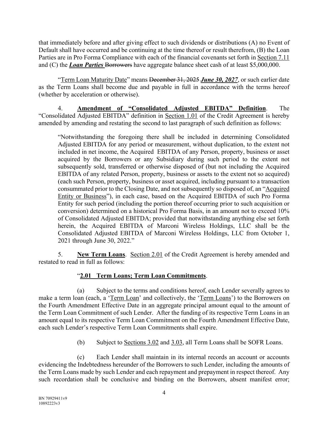 4 BN 70929411v9 10892223v3 that immediately before and after giving effect to such dividends or distributions (A) no Event of Default shall have occurred and be continuing at the time thereof or result therefrom, (B) the Loan Parties are in Pro Forma Compliance with each of the financial covenants set forth in Section 7.11 and (C) the Loan Parties Borrowers have aggregate balance sheet cash of at least $5,000,000. “Term Loan Maturity Date” means December 31, 2025 June 30, 2027, or such earlier date as the Term Loans shall become due and payable in full in accordance with the terms hereof (whether by acceleration or otherwise). 4. Amendment of “Consolidated Adjusted EBITDA” Definition. The “Consolidated Adjusted EBITDA” definition in Section 1.01 of the Credit Agreement is hereby amended by amending and restating the second to last paragraph of such definition as follows: “Notwithstanding the foregoing there shall be included in determining Consolidated Adjusted EBITDA for any period or measurement, without duplication, to the extent not included in net income, the Acquired EBITDA of any Person, property, business or asset acquired by the Borrowers or any Subsidiary during such period to the extent not subsequently sold, transferred or otherwise disposed of (but not including the Acquired EBITDA of any related Person, property, business or assets to the extent not so acquired) (each such Person, property, business or asset acquired, including pursuant to a transaction consummated prior to the Closing Date, and not subsequently so disposed of, an “Acquired Entity or Business”), in each case, based on the Acquired EBITDA of such Pro Forma Entity for such period (including the portion thereof occurring prior to such acquisition or conversion) determined on a historical Pro Forma Basis, in an amount not to exceed 10% of Consolidated Adjusted EBITDA; provided that notwithstanding anything else set forth herein, the Acquired EBITDA of Marconi Wireless Holdings, LLC shall be the Consolidated Adjusted EBITDA of Marconi Wireless Holdings, LLC from October 1, 2021 through June 30, 2022.” 5. New Term Loans. Section 2.01 of the Credit Agreement is hereby amended and restated to read in full as follows: “2.01 Term Loans; Term Loan Commitments. (a) Subject to the terms and conditions hereof, each Lender severally agrees to make a term loan (each, a ‘Term Loan’ and collectively, the ‘Term Loans’) to the Borrowers on the Fourth Amendment Effective Date in an aggregate principal amount equal to the amount of the Term Loan Commitment of such Lender. After the funding of its respective Term Loans in an amount equal to its respective Term Loan Commitment on the Fourth Amendment Effective Date, each such Lender’s respective Term Loan Commitments shall expire. (b) Subject to Sections 3.02 and 3.03, all Term Loans shall be SOFR Loans. (c) Each Lender shall maintain in its internal records an account or accounts evidencing the Indebtedness hereunder of the Borrowers to such Lender, including the amounts of the Term Loans made by such Lender and each repayment and prepayment in respect thereof. Any such recordation shall be conclusive and binding on the Borrowers, absent manifest error;