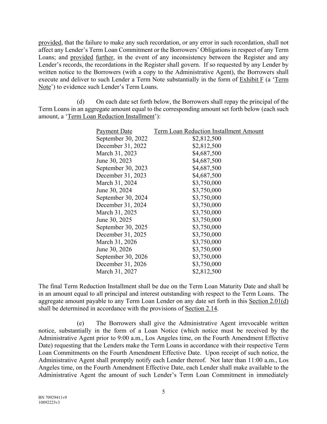 5 BN 70929411v9 10892223v3 provided, that the failure to make any such recordation, or any error in such recordation, shall not affect any Lender’s Term Loan Commitment or the Borrowers’ Obligations in respect of any Term Loans; and provided further, in the event of any inconsistency between the Register and any Lender’s records, the recordations in the Register shall govern. If so requested by any Lender by written notice to the Borrowers (with a copy to the Administrative Agent), the Borrowers shall execute and deliver to such Lender a Term Note substantially in the form of Exhibit F (a ‘Term Note’) to evidence such Lender’s Term Loans. (d) On each date set forth below, the Borrowers shall repay the principal of the Term Loans in an aggregate amount equal to the corresponding amount set forth below (each such amount, a ‘Term Loan Reduction Installment’): Payment Date Term Loan Reduction Installment Amount September 30, 2022 $2,812,500 December 31, 2022 $2,812,500 March 31, 2023 $4,687,500 June 30, 2023 $4,687,500 September 30, 2023 $4,687,500 December 31, 2023 $4,687,500 March 31, 2024 $3,750,000 June 30, 2024 $3,750,000 September 30, 2024 $3,750,000 December 31, 2024 $3,750,000 March 31, 2025 $3,750,000 June 30, 2025 $3,750,000 September 30, 2025 $3,750,000 December 31, 2025 $3,750,000 March 31, 2026 $3,750,000 June 30, 2026 $3,750,000 September 30, 2026 $3,750,000 December 31, 2026 $3,750,000 March 31, 2027 $2,812,500 The final Term Reduction Installment shall be due on the Term Loan Maturity Date and shall be in an amount equal to all principal and interest outstanding with respect to the Term Loans. The aggregate amount payable to any Term Loan Lender on any date set forth in this Section 2.01(d) shall be determined in accordance with the provisions of Section 2.14. (e) The Borrowers shall give the Administrative Agent irrevocable written notice, substantially in the form of a Loan Notice (which notice must be received by the Administrative Agent prior to 9:00 a.m., Los Angeles time, on the Fourth Amendment Effective Date) requesting that the Lenders make the Term Loans in accordance with their respective Term Loan Commitments on the Fourth Amendment Effective Date. Upon receipt of such notice, the Administrative Agent shall promptly notify each Lender thereof. Not later than 11:00 a.m., Los Angeles time, on the Fourth Amendment Effective Date, each Lender shall make available to the Administrative Agent the amount of such Lender’s Term Loan Commitment in immediately