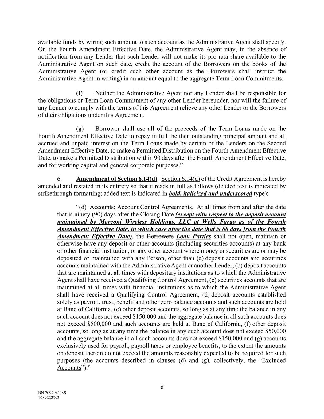 6 BN 70929411v9 10892223v3 available funds by wiring such amount to such account as the Administrative Agent shall specify. On the Fourth Amendment Effective Date, the Administrative Agent may, in the absence of notification from any Lender that such Lender will not make its pro rata share available to the Administrative Agent on such date, credit the account of the Borrowers on the books of the Administrative Agent (or credit such other account as the Borrowers shall instruct the Administrative Agent in writing) in an amount equal to the aggregate Term Loan Commitments. (f) Neither the Administrative Agent nor any Lender shall be responsible for the obligations or Term Loan Commitment of any other Lender hereunder, nor will the failure of any Lender to comply with the terms of this Agreement relieve any other Lender or the Borrowers of their obligations under this Agreement. (g) Borrower shall use all of the proceeds of the Term Loans made on the Fourth Amendment Effective Date to repay in full the then outstanding principal amount and all accrued and unpaid interest on the Term Loans made by certain of the Lenders on the Second Amendment Effective Date, to make a Permitted Distribution on the Fourth Amendment Effective Date, to make a Permitted Distribution within 90 days after the Fourth Amendment Effective Date, and for working capital and general corporate purposes.” 6. Amendment of Section 6.14(d). Section 6.14(d) of the Credit Agreement is hereby amended and restated in its entirety so that it reads in full as follows (deleted text is indicated by strikethrough formatting; added text is indicated in bold, italicized and underscored type): “(d) Accounts; Account Control Agreements. At all times from and after the date that is ninety (90) days after the Closing Date (except with respect to the deposit account maintained by Marconi Wireless Holdings, LLC at Wells Fargo as of the Fourth Amendment Effective Date, in which case after the date that is 60 days from the Fourth Amendment Effective Date), the Borrowers Loan Parties shall not open, maintain or otherwise have any deposit or other accounts (including securities accounts) at any bank or other financial institution, or any other account where money or securities are or may be deposited or maintained with any Person, other than (a) deposit accounts and securities accounts maintained with the Administrative Agent or another Lender, (b) deposit accounts that are maintained at all times with depositary institutions as to which the Administrative Agent shall have received a Qualifying Control Agreement, (c) securities accounts that are maintained at all times with financial institutions as to which the Administrative Agent shall have received a Qualifying Control Agreement, (d) deposit accounts established solely as payroll, trust, benefit and other zero balance accounts and such accounts are held at Banc of California, (e) other deposit accounts, so long as at any time the balance in any such account does not exceed $150,000 and the aggregate balance in all such accounts does not exceed $500,000 and such accounts are held at Banc of California, (f) other deposit accounts, so long as at any time the balance in any such account does not exceed $50,000 and the aggregate balance in all such accounts does not exceed $150,000 and (g) accounts exclusively used for payroll, payroll taxes or employee benefits, to the extent the amounts on deposit therein do not exceed the amounts reasonably expected to be required for such purposes (the accounts described in clauses (d) and (g), collectively, the “Excluded Accounts”).”