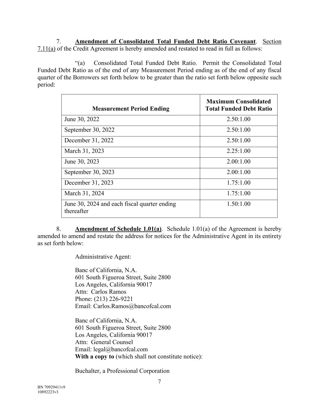 7 BN 70929411v9 10892223v3 7. Amendment of Consolidated Total Funded Debt Ratio Covenant. Section 7.11(a) of the Credit Agreement is hereby amended and restated to read in full as follows: “(a) Consolidated Total Funded Debt Ratio. Permit the Consolidated Total Funded Debt Ratio as of the end of any Measurement Period ending as of the end of any fiscal quarter of the Borrowers set forth below to be greater than the ratio set forth below opposite such period: Measurement Period Ending Maximum Consolidated Total Funded Debt Ratio June 30, 2022 2.50:1.00 September 30, 2022 2.50:1.00 December 31, 2022 2.50:1.00 March 31, 2023 2.25:1.00 June 30, 2023 2.00:1.00 September 30, 2023 2.00:1.00 December 31, 2023 1.75:1.00 March 31, 2024 1.75:1.00 June 30, 2024 and each fiscal quarter ending thereafter 1.50:1.00 8. Amendment of Schedule 1.01(a). Schedule 1.01(a) of the Agreement is hereby amended to amend and restate the address for notices for the Administrative Agent in its entirety as set forth below: Administrative Agent: Banc of California, N.A. 601 South Figueroa Street, Suite 2800 Los Angeles, California 90017 Attn: Carlos Ramos Phone: (213) 226-9221 Email: Carlos.Ramos@bancofcal.com Banc of California, N.A. 601 South Figueroa Street, Suite 2800 Los Angeles, California 90017 Attn: General Counsel Email: legal@bancofcal.com With a copy to (which shall not constitute notice): Buchalter, a Professional Corporation