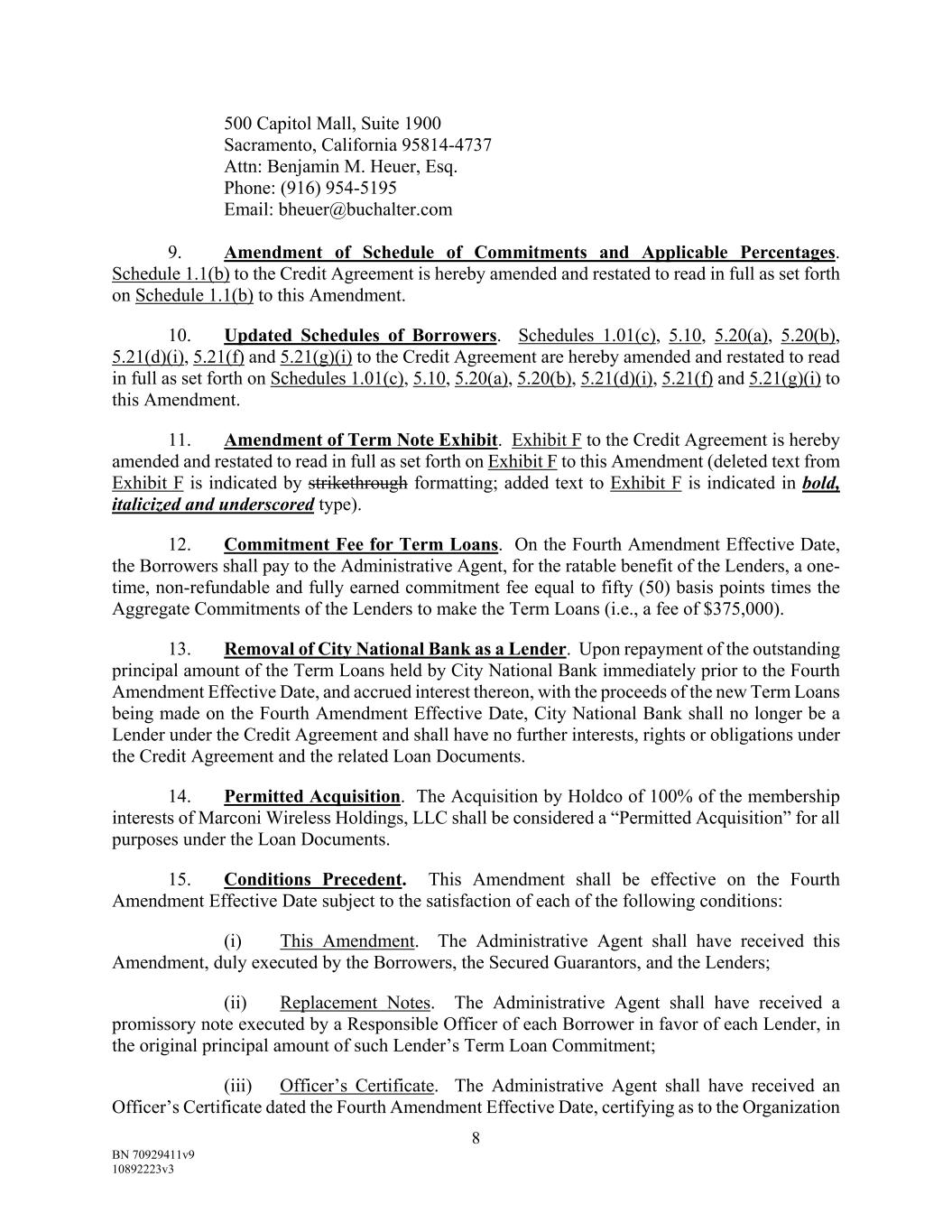 8 BN 70929411v9 10892223v3 500 Capitol Mall, Suite 1900 Sacramento, California 95814-4737 Attn: Benjamin M. Heuer, Esq. Phone: (916) 954-5195 Email: bheuer@buchalter.com 9. Amendment of Schedule of Commitments and Applicable Percentages. Schedule 1.1(b) to the Credit Agreement is hereby amended and restated to read in full as set forth on Schedule 1.1(b) to this Amendment. 10. Updated Schedules of Borrowers. Schedules 1.01(c), 5.10, 5.20(a), 5.20(b), 5.21(d)(i), 5.21(f) and 5.21(g)(i) to the Credit Agreement are hereby amended and restated to read in full as set forth on Schedules 1.01(c), 5.10, 5.20(a), 5.20(b), 5.21(d)(i), 5.21(f) and 5.21(g)(i) to this Amendment. 11. Amendment of Term Note Exhibit. Exhibit F to the Credit Agreement is hereby amended and restated to read in full as set forth on Exhibit F to this Amendment (deleted text from Exhibit F is indicated by strikethrough formatting; added text to Exhibit F is indicated in bold, italicized and underscored type). 12. Commitment Fee for Term Loans. On the Fourth Amendment Effective Date, the Borrowers shall pay to the Administrative Agent, for the ratable benefit of the Lenders, a one- time, non-refundable and fully earned commitment fee equal to fifty (50) basis points times the Aggregate Commitments of the Lenders to make the Term Loans (i.e., a fee of $375,000). 13. Removal of City National Bank as a Lender. Upon repayment of the outstanding principal amount of the Term Loans held by City National Bank immediately prior to the Fourth Amendment Effective Date, and accrued interest thereon, with the proceeds of the new Term Loans being made on the Fourth Amendment Effective Date, City National Bank shall no longer be a Lender under the Credit Agreement and shall have no further interests, rights or obligations under the Credit Agreement and the related Loan Documents. 14. Permitted Acquisition. The Acquisition by Holdco of 100% of the membership interests of Marconi Wireless Holdings, LLC shall be considered a “Permitted Acquisition” for all purposes under the Loan Documents. 15. Conditions Precedent. This Amendment shall be effective on the Fourth Amendment Effective Date subject to the satisfaction of each of the following conditions: (i) This Amendment. The Administrative Agent shall have received this Amendment, duly executed by the Borrowers, the Secured Guarantors, and the Lenders; (ii) Replacement Notes. The Administrative Agent shall have received a promissory note executed by a Responsible Officer of each Borrower in favor of each Lender, in the original principal amount of such Lender’s Term Loan Commitment; (iii) Officer’s Certificate. The Administrative Agent shall have received an Officer’s Certificate dated the Fourth Amendment Effective Date, certifying as to the Organization