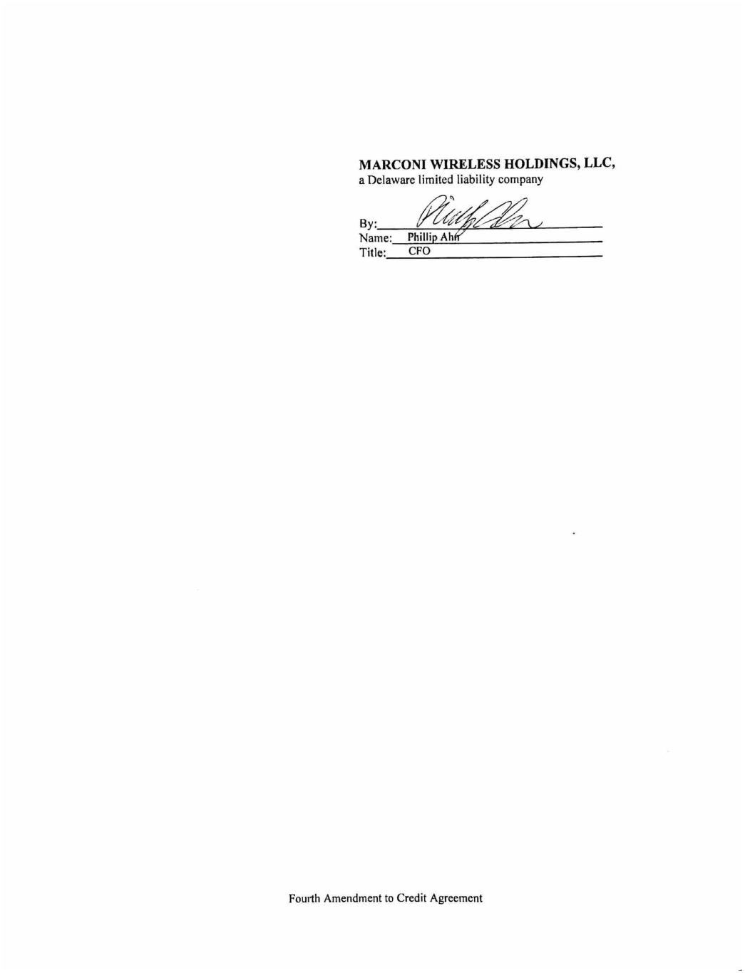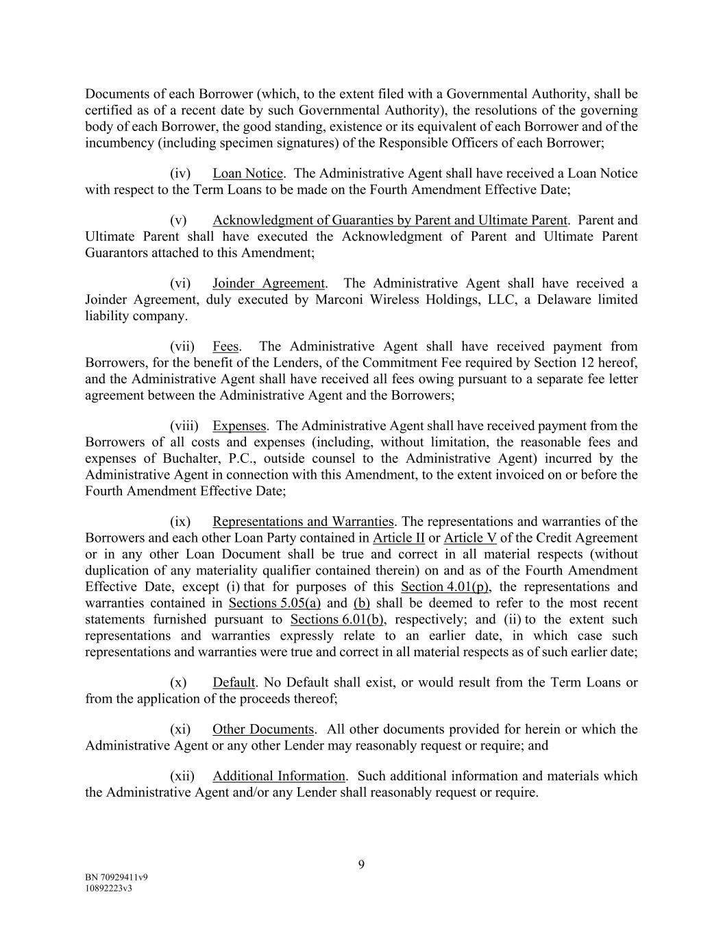 9 BN 70929411v9 10892223v3 Documents of each Borrower (which, to the extent filed with a Governmental Authority, shall be certified as of a recent date by such Governmental Authority), the resolutions of the governing body of each Borrower, the good standing, existence or its equivalent of each Borrower and of the incumbency (including specimen signatures) of the Responsible Officers of each Borrower; (iv) Loan Notice. The Administrative Agent shall have received a Loan Notice with respect to the Term Loans to be made on the Fourth Amendment Effective Date; (v) Acknowledgment of Guaranties by Parent and Ultimate Parent. Parent and Ultimate Parent shall have executed the Acknowledgment of Parent and Ultimate Parent Guarantors attached to this Amendment; (vi) Joinder Agreement. The Administrative Agent shall have received a Joinder Agreement, duly executed by Marconi Wireless Holdings, LLC, a Delaware limited liability company. (vii) Fees. The Administrative Agent shall have received payment from Borrowers, for the benefit of the Lenders, of the Commitment Fee required by Section 12 hereof, and the Administrative Agent shall have received all fees owing pursuant to a separate fee letter agreement between the Administrative Agent and the Borrowers; (viii) Expenses. The Administrative Agent shall have received payment from the Borrowers of all costs and expenses (including, without limitation, the reasonable fees and expenses of Buchalter, P.C., outside counsel to the Administrative Agent) incurred by the Administrative Agent in connection with this Amendment, to the extent invoiced on or before the Fourth Amendment Effective Date; (ix) Representations and Warranties. The representations and warranties of the Borrowers and each other Loan Party contained in Article II or Article V of the Credit Agreement or in any other Loan Document shall be true and correct in all material respects (without duplication of any materiality qualifier contained therein) on and as of the Fourth Amendment Effective Date, except (i) that for purposes of this Section 4.01(p), the representations and warranties contained in Sections 5.05(a) and (b) shall be deemed to refer to the most recent statements furnished pursuant to Sections 6.01(b), respectively; and (ii) to the extent such representations and warranties expressly relate to an earlier date, in which case such representations and warranties were true and correct in all material respects as of such earlier date; (x) Default. No Default shall exist, or would result from the Term Loans or from the application of the proceeds thereof; (xi) Other Documents. All other documents provided for herein or which the Administrative Agent or any other Lender may reasonably request or require; and (xii) Additional Information. Such additional information and materials which the Administrative Agent and/or any Lender shall reasonably request or require.