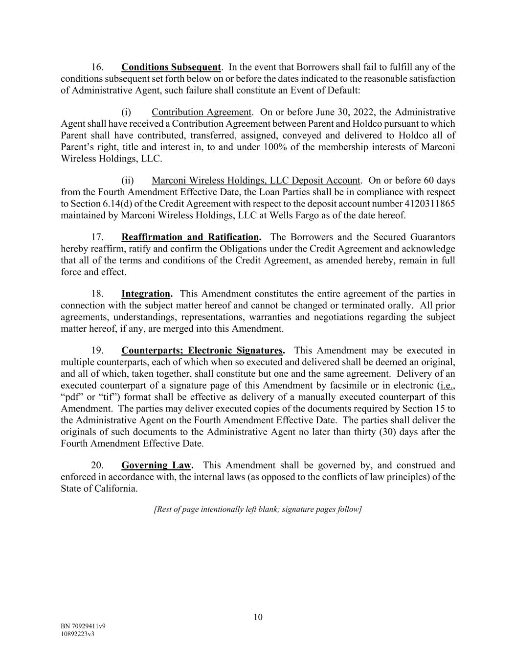 10 BN 70929411v9 10892223v3 16. Conditions Subsequent. In the event that Borrowers shall fail to fulfill any of the conditions subsequent set forth below on or before the dates indicated to the reasonable satisfaction of Administrative Agent, such failure shall constitute an Event of Default: (i) Contribution Agreement. On or before June 30, 2022, the Administrative Agent shall have received a Contribution Agreement between Parent and Holdco pursuant to which Parent shall have contributed, transferred, assigned, conveyed and delivered to Holdco all of Parent’s right, title and interest in, to and under 100% of the membership interests of Marconi Wireless Holdings, LLC. (ii) Marconi Wireless Holdings, LLC Deposit Account. On or before 60 days from the Fourth Amendment Effective Date, the Loan Parties shall be in compliance with respect to Section 6.14(d) of the Credit Agreement with respect to the deposit account number 4120311865 maintained by Marconi Wireless Holdings, LLC at Wells Fargo as of the date hereof. 17. Reaffirmation and Ratification. The Borrowers and the Secured Guarantors hereby reaffirm, ratify and confirm the Obligations under the Credit Agreement and acknowledge that all of the terms and conditions of the Credit Agreement, as amended hereby, remain in full force and effect. 18. Integration. This Amendment constitutes the entire agreement of the parties in connection with the subject matter hereof and cannot be changed or terminated orally. All prior agreements, understandings, representations, warranties and negotiations regarding the subject matter hereof, if any, are merged into this Amendment. 19. Counterparts; Electronic Signatures. This Amendment may be executed in multiple counterparts, each of which when so executed and delivered shall be deemed an original, and all of which, taken together, shall constitute but one and the same agreement. Delivery of an executed counterpart of a signature page of this Amendment by facsimile or in electronic (i.e., “pdf” or “tif”) format shall be effective as delivery of a manually executed counterpart of this Amendment. The parties may deliver executed copies of the documents required by Section 15 to the Administrative Agent on the Fourth Amendment Effective Date. The parties shall deliver the originals of such documents to the Administrative Agent no later than thirty (30) days after the Fourth Amendment Effective Date. 20. Governing Law. This Amendment shall be governed by, and construed and enforced in accordance with, the internal laws (as opposed to the conflicts of law principles) of the State of California. [Rest of page intentionally left blank; signature pages follow]