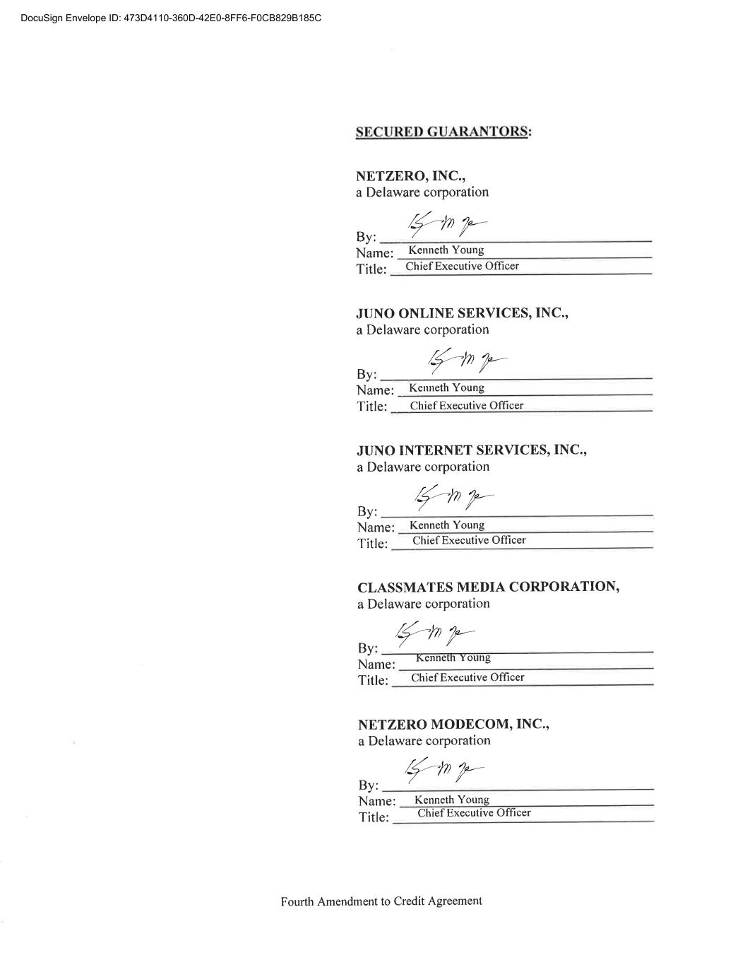 SECURED GUABANTORS NETZERO,INC., a Delaware corporation By: Name: Title: Kenneth Young Chief Executive Officer JUNO ONLINE SERVICES, INC., a Delaware corporation By Name: Title: Kenneth Young Chief Executive Officer JUNO INTERNET SERVICES, INC., a Delaware corporation By: Name: Title: Kenneth Young Chief Executive Officer CLASSMATES MEDIA CORPORATION, a Delaware corporation By Name Title: Kennetn Young Chief Executive Officer NETZERO MODECOM,INC., a Delaware corporation By: Name: Title: Kenneth Young Cnief niecutive Officer Fourth Amendment to Credit Agreement DocuSign Envelope ID: 473D4110-360D-42E0-8FF6-F0CB829B185C