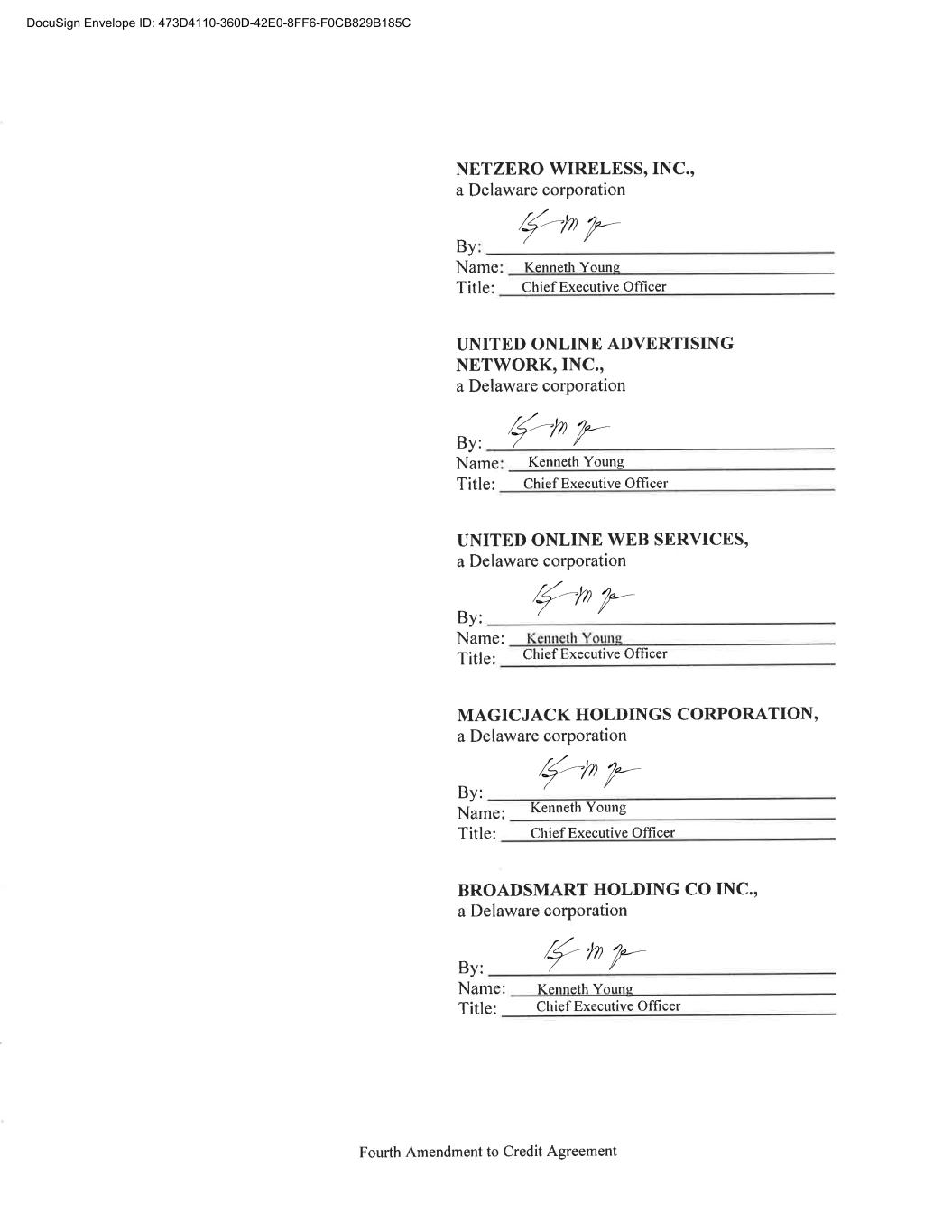 NETZERO WIRELESS, INC., a Delaware corporation Name Title: By By: By: Kenneth Youns Chief Executive Officer UNITED ONLINE ADVERTISING NETWORK,INC., a Delaware corporation Name Title: Kenneth Young Chief Executive Officer UNITED ONLINE WEB SERVICES, a Delaware corporation Name: Title: Kenneth Youns Chief Executive Officer Kenneth Young Chief Executive Officer MAGICJACK HOLDINGS CORPORATION, a Delaware corporation By: Name: Title: BROADSMART HOLDING CO INC., a Delaware corporation By: Name: Title: Kenneth Yorrns Chief Executive Officer Fourth Amendment to Credit Agreement DocuSign Envelope ID: 473D4110-360D-42E0-8FF6-F0CB829B185C
