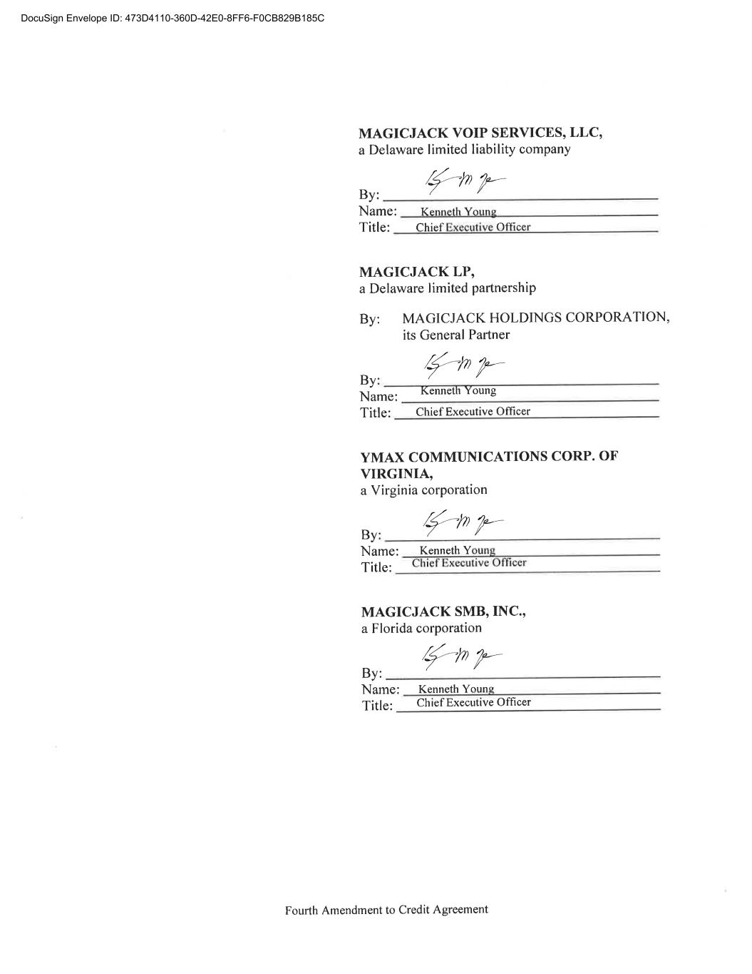 MAGICJACK VOIP SERVICES, LLC, a Delaware limited liability company By: Name: Title: Kennefh Vnrrno Chief Officer MAGICJACK LP, a Delaware limited partnership By: MAGICJACKHOLDINGSCORPORATION' its General Partner By Name: Title: Kenneth Young Chief Executive Officer YMAX COMMUNICATIONS CORP. OF vIRGINIA, a Virginia corporation By Name: Title: Kenneth Y MAGICJACK SMB,INC., a Florida corporation By: Name: Title: Kenneth Yolln g Chief Executive Officer Fourth Amendment to Credit Agreement DocuSign Envelope ID: 473D4110-360D-42E0-8FF6-F0CB829B185C
