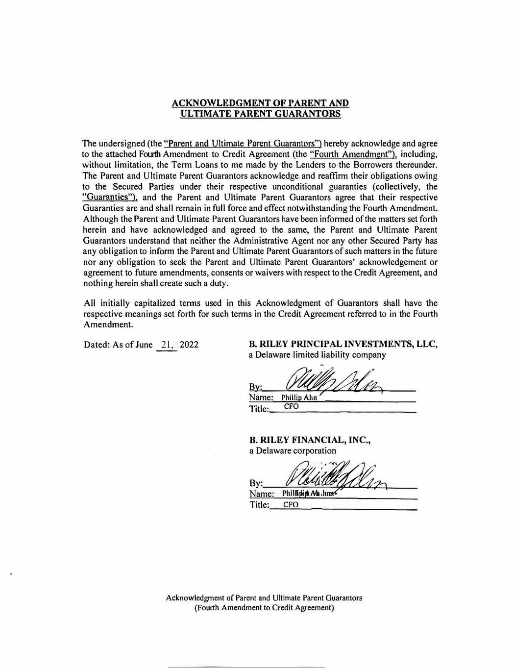ACKNOWLliDGMENT OF PARENT AND ULTIMATE PARENT GUARANTORS The undersigned (the "Parent and Ultimate Parent Guarantors") hereby acknowledge and agree to the attached Founh Amendment to Credit Agreement (the "Fourth Amendment"), including, without limitation, the Term Loans to me made by the Lenders to the Borrowers thereunder. The Parent and Ultimate Parent Guarantors acknowledge and reaffirm their obligations owing to the Secured Parties under their respective unconditional guaranties (collectively, the "Guaranties"), and the Parent and Ultimate Parent Guarantors agree that their respective Guaranties are and shall remain in full force and effect notwithstanding the Fourth Amendment. Although the Parent and Ultimate Parent Guarantors have been informed of the matters set forth herein and have acknowledged and agreed to the same, the Parent and Ultimate Parent Guarantors understand that neither the Administrative Agent nor any other Secured Party has any obligation to inform the Parent and Ultimate Parent Guarantors of such matters in the future nor any obligation to seek the Parent and Ultimate Parent Guarantors' acknowledgement or agreement to future amendments, consents or waivers with respect to the Credit Agreement, and nothing herein shall create such a duty. All initially capitalized terms used in this Acknowledgment of Guarantors shall have the respective meanings set forth for such terms in the Credit Agreement referred to in the Fourth Amendment. B. RILEY PRINCIPAL INVESTMENTS, LLC,a Delaware limited liability company � By:---'�------........,......�_______.�..._? ::::'J -Name:----'P�h�il�lip�A�l�in"-----------Title: __ C_f'_O __________ _ B. RILEY FINANCIAL, INC.,a Delaware corporation ���-e_:_P�fl,--1 �-A-�-:-r-..... �� ...... ' -.+-'/�--'<,-- --�-----------Title: CFO -------------- Acknowledgment of Parent and Ultimate Parent Guarantors (Fourth Amendment to Credit Agreement) Dated: As of June __ 2022 21,