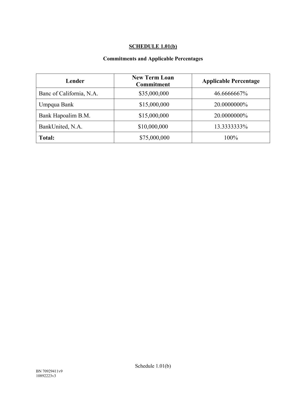 Schedule 1.01(b) BN 70929411v9 10892223v3 SCHEDULE 1.01(b) Commitments and Applicable Percentages Lender New Term Loan Commitment Applicable Percentage Banc of California, N.A. $35,000,000 46.6666667% Umpqua Bank $15,000,000 20.0000000% Bank Hapoalim B.M. $15,000,000 20.0000000% BankUnited, N.A. $10,000,000 13.3333333% Total: $75,000,000 100%