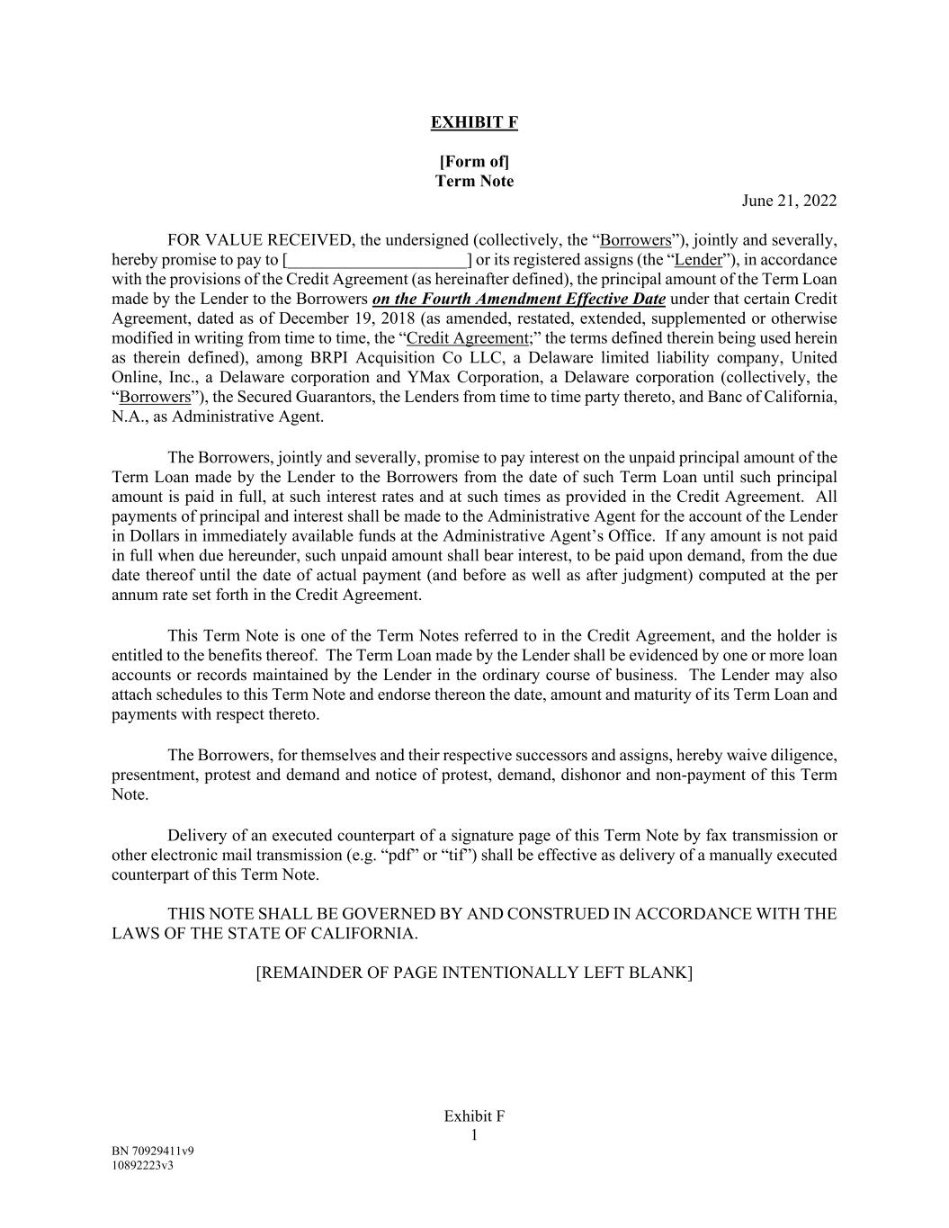 Exhibit F 1 BN 70929411v9 10892223v3 EXHIBIT F [Form of] Term Note June 21, 2022 FOR VALUE RECEIVED, the undersigned (collectively, the “Borrowers”), jointly and severally, hereby promise to pay to [_____________________] or its registered assigns (the “Lender”), in accordance with the provisions of the Credit Agreement (as hereinafter defined), the principal amount of the Term Loan made by the Lender to the Borrowers on the Fourth Amendment Effective Date under that certain Credit Agreement, dated as of December 19, 2018 (as amended, restated, extended, supplemented or otherwise modified in writing from time to time, the “Credit Agreement;” the terms defined therein being used herein as therein defined), among BRPI Acquisition Co LLC, a Delaware limited liability company, United Online, Inc., a Delaware corporation and YMax Corporation, a Delaware corporation (collectively, the “Borrowers”), the Secured Guarantors, the Lenders from time to time party thereto, and Banc of California, N.A., as Administrative Agent. The Borrowers, jointly and severally, promise to pay interest on the unpaid principal amount of the Term Loan made by the Lender to the Borrowers from the date of such Term Loan until such principal amount is paid in full, at such interest rates and at such times as provided in the Credit Agreement. All payments of principal and interest shall be made to the Administrative Agent for the account of the Lender in Dollars in immediately available funds at the Administrative Agent’s Office. If any amount is not paid in full when due hereunder, such unpaid amount shall bear interest, to be paid upon demand, from the due date thereof until the date of actual payment (and before as well as after judgment) computed at the per annum rate set forth in the Credit Agreement. This Term Note is one of the Term Notes referred to in the Credit Agreement, and the holder is entitled to the benefits thereof. The Term Loan made by the Lender shall be evidenced by one or more loan accounts or records maintained by the Lender in the ordinary course of business. The Lender may also attach schedules to this Term Note and endorse thereon the date, amount and maturity of its Term Loan and payments with respect thereto. The Borrowers, for themselves and their respective successors and assigns, hereby waive diligence, presentment, protest and demand and notice of protest, demand, dishonor and non-payment of this Term Note. Delivery of an executed counterpart of a signature page of this Term Note by fax transmission or other electronic mail transmission (e.g. “pdf” or “tif”) shall be effective as delivery of a manually executed counterpart of this Term Note. THIS NOTE SHALL BE GOVERNED BY AND CONSTRUED IN ACCORDANCE WITH THE LAWS OF THE STATE OF CALIFORNIA. [REMAINDER OF PAGE INTENTIONALLY LEFT BLANK]