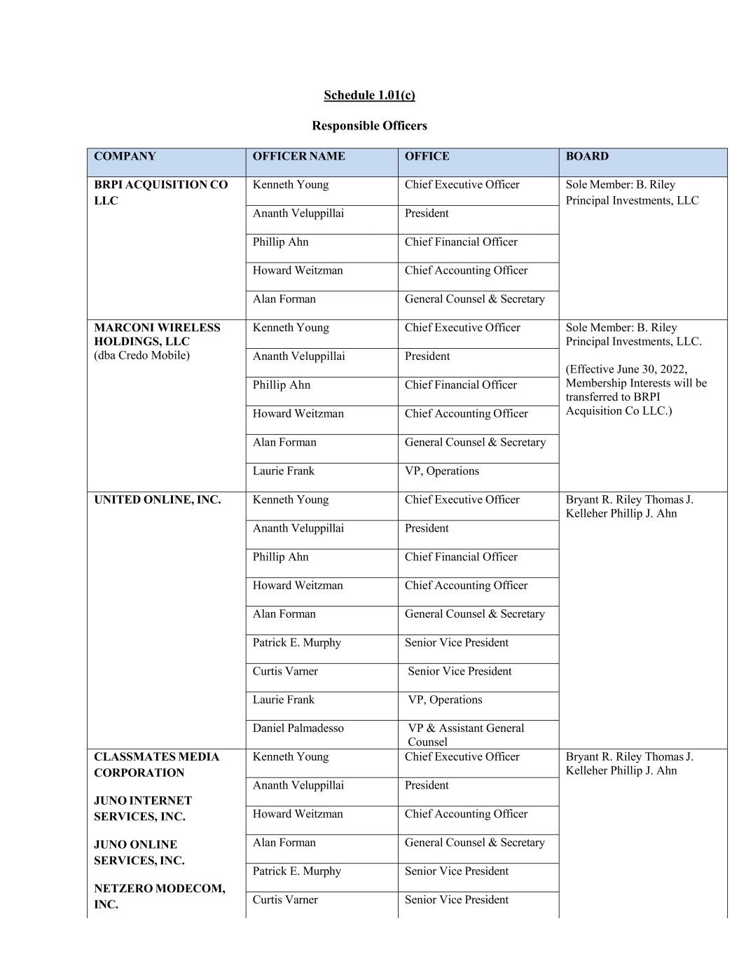 Schedule 1.01(c) Responsible Officers COMPANY OFFICER NAME OFFICE BOARD BRPI ACQUISITION CO LLC Kenneth Young Chief Executive Officer Sole Member: B. Riley Principal Investments, LLC Ananth Veluppillai President Phillip Ahn Chief Financial Officer Howard Weitzman Chief Accounting Officer Alan Forman General Counsel & Secretary MARCONI WIRELESS HOLDINGS, LLC (dba Credo Mobile) Kenneth Young Chief Executive Officer Sole Member: B. Riley Principal Investments, LLC. (Effective June 30, 2022, Membership Interests will be transferred to BRPI Acquisition Co LLC.) Ananth Veluppillai President Phillip Ahn Chief Financial Officer Howard Weitzman Chief Accounting Officer Alan Forman General Counsel & Secretary Laurie Frank VP, Operations UNITED ONLINE, INC. Kenneth Young Chief Executive Officer Bryant R. Riley Thomas J. Kelleher Phillip J. Ahn Ananth Veluppillai President Phillip Ahn Chief Financial Officer Howard Weitzman Chief Accounting Officer Alan Forman General Counsel & Secretary Patrick E. Murphy Senior Vice President Curtis Varner Senior Vice President Laurie Frank VP, Operations Daniel Palmadesso VP & Assistant General Counsel CLASSMATES MEDIA CORPORATION Kenneth Young Chief Executive Officer Bryant R. Riley Thomas J. Kelleher Phillip J. Ahn Ananth Veluppillai President JUNO INTERNET SERVICES, INC. Howard Weitzman Chief Accounting Officer JUNO ONLINE SERVICES, INC. Alan Forman General Counsel & Secretary Patrick E. Murphy Senior Vice President NETZERO MODECOM, INC. Curtis Varner Senior Vice President