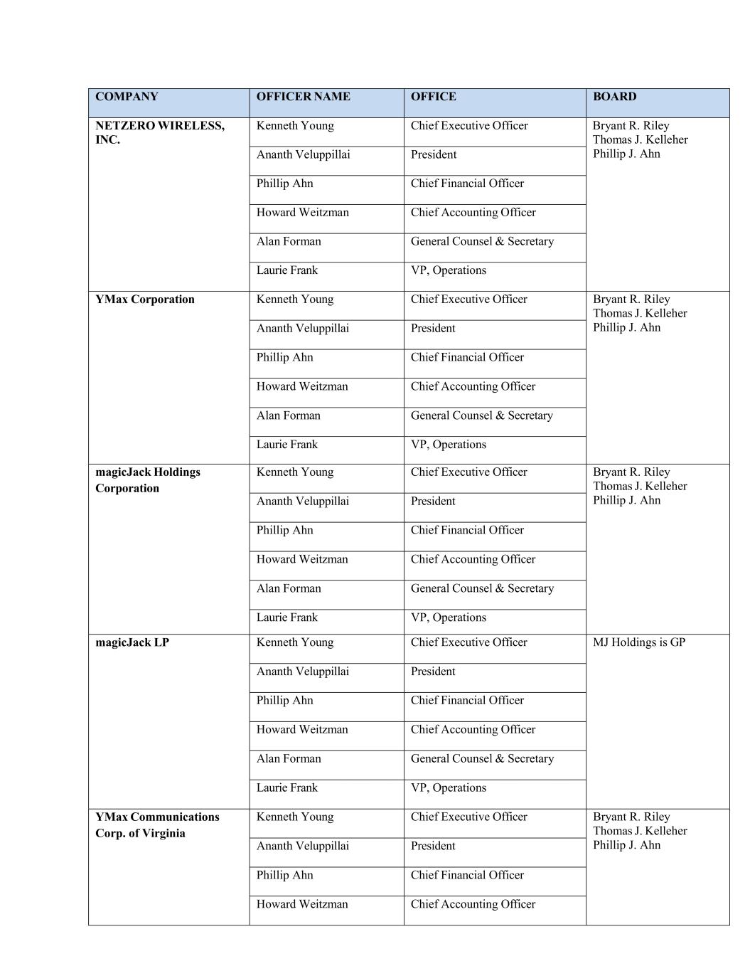 COMPANY OFFICER NAME OFFICE BOARD NETZERO WIRELESS, INC. Kenneth Young Chief Executive Officer Bryant R. Riley Thomas J. Kelleher Phillip J. Ahn Ananth Veluppillai President Phillip Ahn Chief Financial Officer Howard Weitzman Chief Accounting Officer Alan Forman General Counsel & Secretary Laurie Frank VP, Operations YMax Corporation Kenneth Young Chief Executive Officer Bryant R. Riley Thomas J. Kelleher Phillip J. Ahn Ananth Veluppillai President Phillip Ahn Chief Financial Officer Howard Weitzman Chief Accounting Officer Alan Forman General Counsel & Secretary Laurie Frank VP, Operations magicJack Holdings Corporation Kenneth Young Chief Executive Officer Bryant R. Riley Thomas J. Kelleher Phillip J. Ahn Ananth Veluppillai President Phillip Ahn Chief Financial Officer Howard Weitzman Chief Accounting Officer Alan Forman General Counsel & Secretary Laurie Frank VP, Operations magicJack LP Kenneth Young Chief Executive Officer MJ Holdings is GP Ananth Veluppillai President Phillip Ahn Chief Financial Officer Howard Weitzman Chief Accounting Officer Alan Forman General Counsel & Secretary Laurie Frank VP, Operations YMax Communications Corp. of Virginia Kenneth Young Chief Executive Officer Bryant R. Riley Thomas J. Kelleher Phillip J. Ahn Ananth Veluppillai President Phillip Ahn Chief Financial Officer Howard Weitzman Chief Accounting Officer