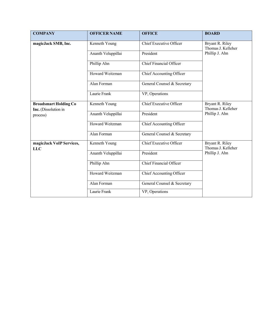 COMPANY OFFICER NAME OFFICE BOARD magicJack SMB, Inc. Kenneth Young Chief Executive Officer Bryant R. Riley Thomas J. Kelleher Phillip J. Ahn Ananth Veluppillai President Phillip Ahn Chief Financial Officer Howard Weitzman Chief Accounting Officer Alan Forman General Counsel & Secretary Laurie Frank VP, Operations Broadsmart Holding Co Inc. (Dissolution in process) Kenneth Young Chief Executive Officer Bryant R. Riley Thomas J. Kelleher Phillip J. Ahn Ananth Veluppillai President Howard Weitzman Chief Accounting Officer Alan Forman General Counsel & Secretary magicJack VoIP Services, LLC Kenneth Young Chief Executive Officer Bryant R. Riley Thomas J. Kelleher Phillip J. Ahn Ananth Veluppillai President Phillip Ahn Chief Financial Officer Howard Weitzman Chief Accounting Officer Alan Forman General Counsel & Secretary Laurie Frank VP, Operations