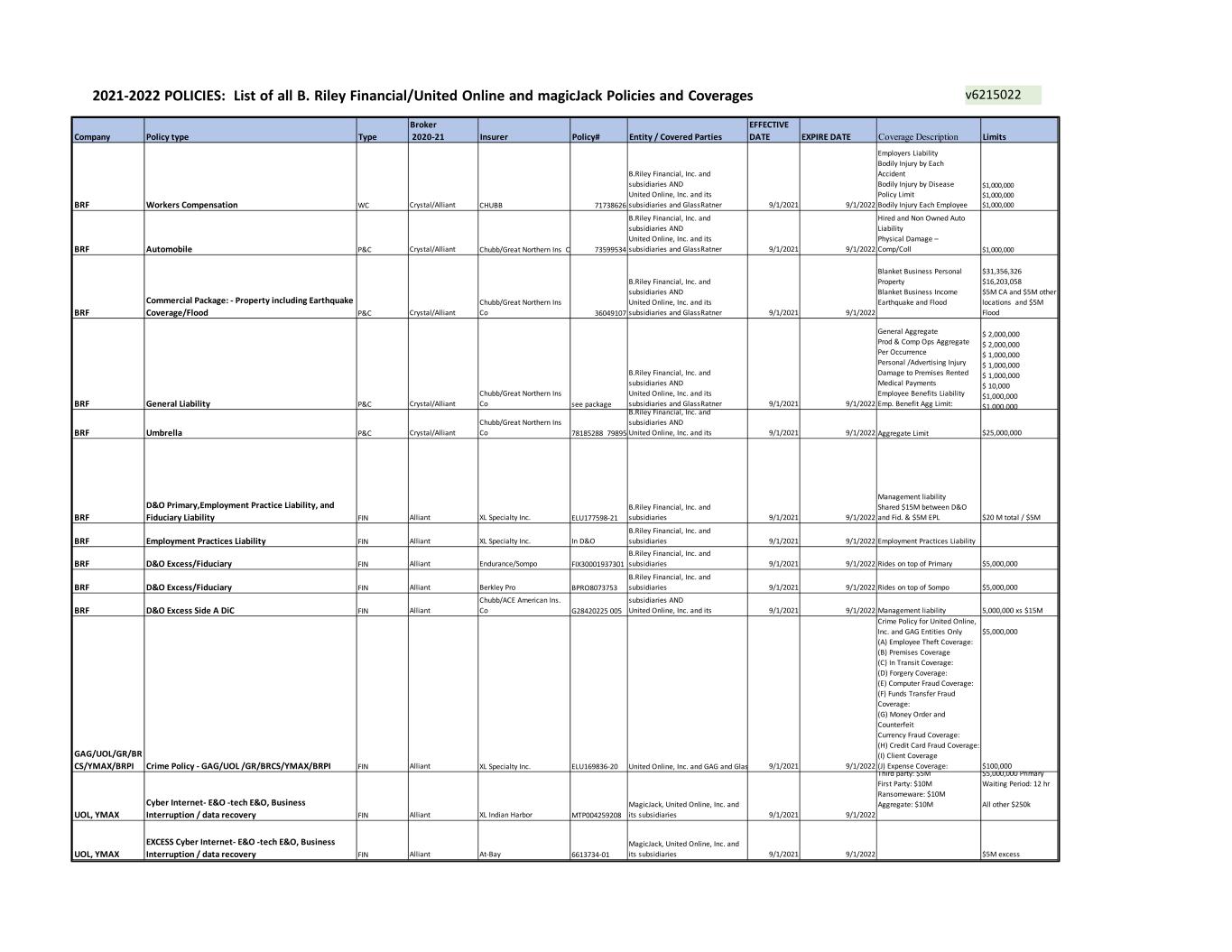 2021-2022 POLICIES: List of all B. Riley Financial/United Online and magicJack Policies and Coverages Company Policy type Type Broker 2020-21 Insurer Policy# Entity / Covered Parties EFFECTIVE DATE EXPIRE DATE Coverage Description Limits BRF Workers Compensation WC Crystal/Alliant CHUBB 71738626 B.Riley Financial, Inc. and subsidiaries AND United Online, Inc. and its subsidiaries and GlassRatner 9/1/2021 9/1/2022 Employers Liability Bodily Injury by Each Accident Bodily Injury by Disease Policy Limit Bodily Injury Each Employee $1,000,000 $1,000,000 $1,000,000 BRF Automobile P&C Crystal/Alliant Chubb/Great Northern Ins Co 73599534 B.Riley Financial, Inc. and subsidiaries AND United Online, Inc. and its subsidiaries and GlassRatner 9/1/2021 9/1/2022 Hired and Non Owned Auto Liability Physical Damage – Comp/Coll $1,000,000 BRF Commercial Package: - Property including Earthquake Coverage/Flood P&C Crystal/Alliant Chubb/Great Northern Ins Co 36049107 B.Riley Financial, Inc. and subsidiaries AND United Online, Inc. and its subsidiaries and GlassRatner 9/1/2021 9/1/2022 Blanket Business Personal Property Blanket Business Income Earthquake and Flood $31,356,326 $16,203,058 $5M CA and $5M other locations and $5M Flood BRF General Liability P&C Crystal/Alliant Chubb/Great Northern Ins Co see package B.Riley Financial, Inc. and subsidiaries AND United Online, Inc. and its subsidiaries and GlassRatner 9/1/2021 9/1/2022 General Aggregate Prod & Comp Ops Aggregate Per Occurrence Personal /Advertising Injury Damage to Premises Rented Medical Payments Employee Benefits Liability Emp. Benefit Agg Limit: $ 2,000,000 $ 2,000,000 $ 1,000,000 $ 1,000,000 $ 1,000,000 $ 10,000 $1,000,000 $1,000,000 BRF Umbrella P&C Crystal/Alliant Chubb/Great Northern Ins Co 78185288 798950 B.Riley Financial, Inc. and subsidiaries AND United Online, Inc. and its 9/1/2021 9/1/2022 Aggregate Limit $25,000,000 BRF D&O Primary,Employment Practice Liability, and Fiduciary Liability FIN Alliant XL Specialty Inc. ELU177598-21 B.Riley Financial, Inc. and subsidiaries 9/1/2021 9/1/2022 Management liability Shared $15M between D&O and Fid. & $5M EPL $20 M total / $5M BRF Employment Practices Liability FIN Alliant XL Specialty Inc. In D&O B.Riley Financial, Inc. and subsidiaries 9/1/2021 9/1/2022 Employment Practices Liability BRF D&O Excess/Fiduciary FIN Alliant Endurance/Sompo FIX30001937301 B.Riley Financial, Inc. and subsidiaries 9/1/2021 9/1/2022 Rides on top of Primary $5,000,000 BRF D&O Excess/Fiduciary FIN Alliant Berkley Pro BPRO8073753 B.Riley Financial, Inc. and subsidiaries 9/1/2021 9/1/2022 Rides on top of Sompo $5,000,000 BRF D&O Excess Side A DiC FIN Alliant Chubb/ACE American Ins. Co G28420225 005 y , subsidiaries AND United Online, Inc. and its 9/1/2021 9/1/2022 Management liability 5,000,000 xs $15M GAG/UOL/GR/BR CS/YMAX/BRPI Crime Policy - GAG/UOL /GR/BRCS/YMAX/BRPI FIN Alliant XL Specialty Inc. ELU169836-20 United Online, Inc. and GAG and Glas 9/1/2021 9/1/2022 Crime Policy for United Online, Inc. and GAG Entities Only (A) Employee Theft Coverage: (B) Premises Coverage (C) In Transit Coverage: (D) Forgery Coverage: (E) Computer Fraud Coverage: (F) Funds Transfer Fraud Coverage: (G) Money Order and Counterfeit Currency Fraud Coverage: (H) Credit Card Fraud Coverage: (I) Client Coverage (J) Expense Coverage: $5,000,000 $100,000 UOL, YMAX Cyber Internet- E&O -tech E&O, Business Interruption / data recovery FIN Alliant XL Indian Harbor MTP004259208 MagicJack, United Online, Inc. and its subsidiaries 9/1/2021 9/1/2022 Third party: $5M First Party: $10M Ransomeware: $10M Aggregate: $10M $5,000,000 Primary Waiting Period: 12 hr All other $250k UOL, YMAX EXCESS Cyber Internet- E&O -tech E&O, Business Interruption / data recovery FIN Alliant At-Bay 6613734-01 MagicJack, United Online, Inc. and its subsidiaries 9/1/2021 9/1/2022 $5M excess v6215022