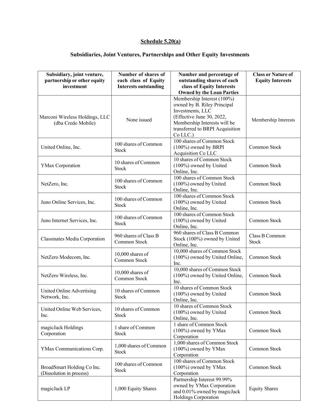Schedule 5.20(a) Subsidiaries, Joint Ventures, Partnerships and Other Equity Investments Subsidiary, joint venture, partnership or other equity investment Number of shares of each class of Equity Interests outstanding Number and percentage of outstanding shares of each class of Equity Interests Owned by the Loan Parties Class or Nature of Equity Interests Marconi Wireless Holdings, LLC (dba Credo Mobile) None issued Membership Interest (100%) owned by B. Riley Principal Investments, LLC (Effective June 30, 2022, Membership Interests will be transferred to BRPI Acquisition Co LLC.) Membership Interests United Online, Inc. 100 shares of Common Stock 100 shares of Common Stock (100%) owned by BRPI Acquisition Co LLC Common Stock YMax Corporation 10 shares of Common Stock 10 shares of Common Stock (100%) owned by United Online, Inc. Common Stock NetZero, Inc. 100 shares of Common Stock 100 shares of Common Stock (100%) owned by United Online, Inc. Common Stock Juno Online Services, Inc. 100 shares of Common Stock 100 shares of Common Stock (100%) owned by United Online, Inc. Common Stock Juno Internet Services, Inc. 100 shares of Common Stock 100 shares of Common Stock (100%) owned by United Online, Inc. Common Stock Classmates Media Corporation 960 shares of Class B Common Stock 960 shares of Class B Common Stock (100%) owned by United Online, Inc. Class B Common Stock NetZero Modecom, Inc. 10,000 shares of Common Stock 10,000 shares of Common Stock (100%) owned by United Online, Inc. Common Stock NetZero Wireless, Inc. 10,000 shares of Common Stock 10,000 shares of Common Stock (100%) owned by United Online, Inc. Common Stock United Online Advertising Network, Inc. 10 shares of Common Stock 10 shares of Common Stock (100%) owned by United Online, Inc. Common Stock United Online Web Services, Inc. 10 shares of Common Stock 10 shares of Common Stock (100%) owned by United Online, Inc. Common Stock magicJack Holdings Corporation 1 share of Common Stock 1 share of Common Stock (100%) owned by YMax Corporation Common Stock YMax Communications Corp. 1,000 shares of Common Stock 1,000 shares of Common Stock (100%) owned by YMax Corporation Common Stock BroadSmart Holding Co Inc. (Dissolution in process) 100 shares of Common Stock 100 shares of Common Stock (100%) owned by YMax Corporation Common Stock magicJack LP 1,000 Equity Shares Partnership Interest 99.99% owned by YMax Corporation and 0.01% owned by magicJack Holdings Corporation Equity Shares