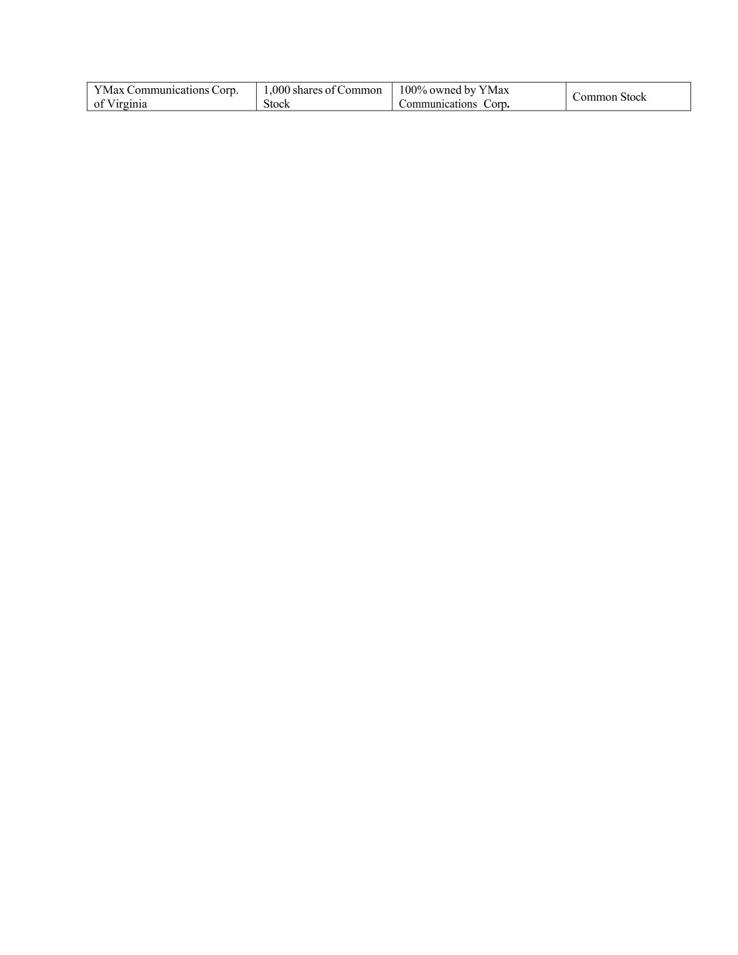 YMax Communications Corp. of Virginia 1,000 shares of Common Stock 100% owned by YMax Communications Corp. Common Stock