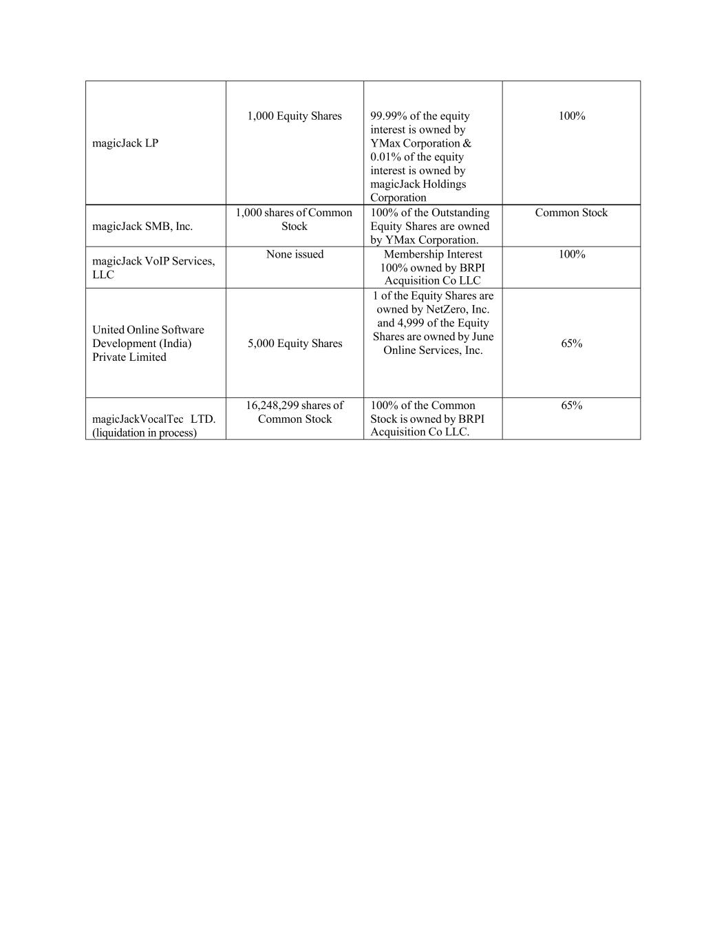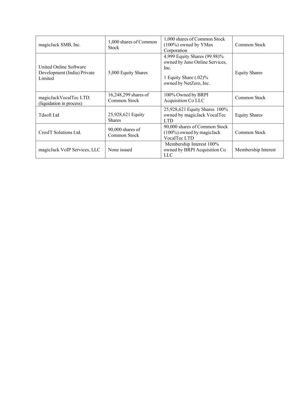 magicJack SMB, Inc. 1,000 shares of Common Stock 1,000 shares of Common Stock (100%) owned by YMax Corporation Common Stock United Online Software Development (India) Private Limited 5,000 Equity Shares 4,999 Equity Shares (99.98)% owned by Juno Online Services, Inc. 1 Equity Share (.02)% owned by NetZero, Inc. Equity Shares magicJackVocalTec LTD. (liquidation in process) 16,248,299 shares of Common Stock 100% Owned by BRPI Acquisition Co LLC Common Stock Tdsoft Ltd 25,928,621 Equity Shares 25,928,621 Equity Shares 100% owned by magicJack VocalTec LTD Equity Shares CrosIT Solutions Ltd. 90,000 shares of Common Stock 90,000 shares of Common Stock (100%) owned by magicJack VocalTec LTD Common Stock magicJack VoIP Services, LLC None issued Membership Interest 100% owned by BRPI Acquisition Co LLC Membership Interest