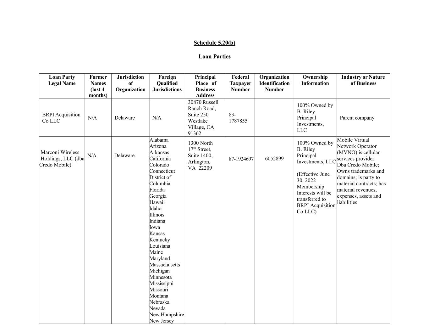 Schedule 5.20(b) Loan Parties Loan Party Legal Name Former Names (last 4 months) Jurisdiction of Organization Foreign Qualified Jurisdictions Principal Place of Business Address Federal Taxpayer Number Organization Identification Number Ownership Information Industry or Nature of Business BRPI Acquisition Co LLC N/A Delaware N/A 30870 Russell Ranch Road, Suite 250 Westlake Village, CA 91362 83- 1787855 100% Owned by B. Riley Principal Investments, LLC Parent company Marconi Wireless Holdings, LLC (dba Credo Mobile) N/A Delaware Alabama Arizona Arkansas California Colorado Connecticut District of Columbia Florida Georgia Hawaii Idaho Illinois Indiana Iowa Kansas Kentucky Louisiana Maine Maryland Massachusetts Michigan Minnesota Mississippi Missouri Montana Nebraska Nevada New Hampshire New Jersey 1300 North 17th Street, Suite 1400, Arlington, VA 22209 87-1924697 6052899 100% Owned by B. Riley Principal Investments, LLC (Effective June 30, 2022 Membership Interests will be transferred to BRPI Acquisition Co LLC) Mobile Virtual Network Operator (MVNO) is cellular services provider. Dba Credo Mobile; Owns trademarks and domains; is party to material contracts; has material revenues, expenses, assets and liabilities