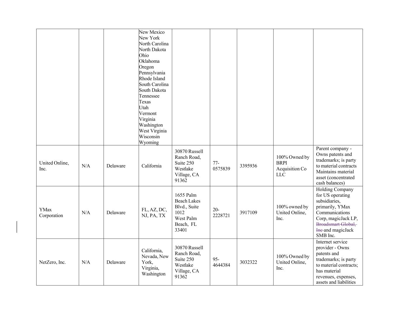 New Mexico New York North Carolina North Dakota Ohio Oklahoma Oregon Pennsylvania Rhode Island South Carolina South Dakota Tennessee Texas Utah Vermont Virginia Washington West Virginia Wisconsin Wyoming United Online, Inc. N/A Delaware California 30870 Russell Ranch Road, Suite 250 Westlake Village, CA 91362 77- 0575839 3395936 100% Owned by BRPI Acquisition Co LLC Parent company - Owns patents and trademarks; is party to material contracts Maintains material asset (concentrated cash balances) YMax Corporation N/A Delaware FL, AZ, DC, NJ, PA, TX 1655 Palm Beach Lakes Blvd., Suite 1012 West Palm Beach, FL 33401 20- 2228721 3917109 100% owned by United Online, Inc. Holding Company for US operating subsidiaries, primarily, YMax Communications Corp, magicJack LP, Broadsmart Global, Inc and magicJack SMB Inc. NetZero, Inc. N/A Delaware California, Nevada, New York, Virginia, Washington 30870 Russell Ranch Road, Suite 250 Westlake Village, CA 91362 95- 4644384 3032322 100% Owned by United Online, Inc. Internet service provider - Owns patents and trademarks; is party to material contracts; has material revenues, expenses, assets and liabilities
