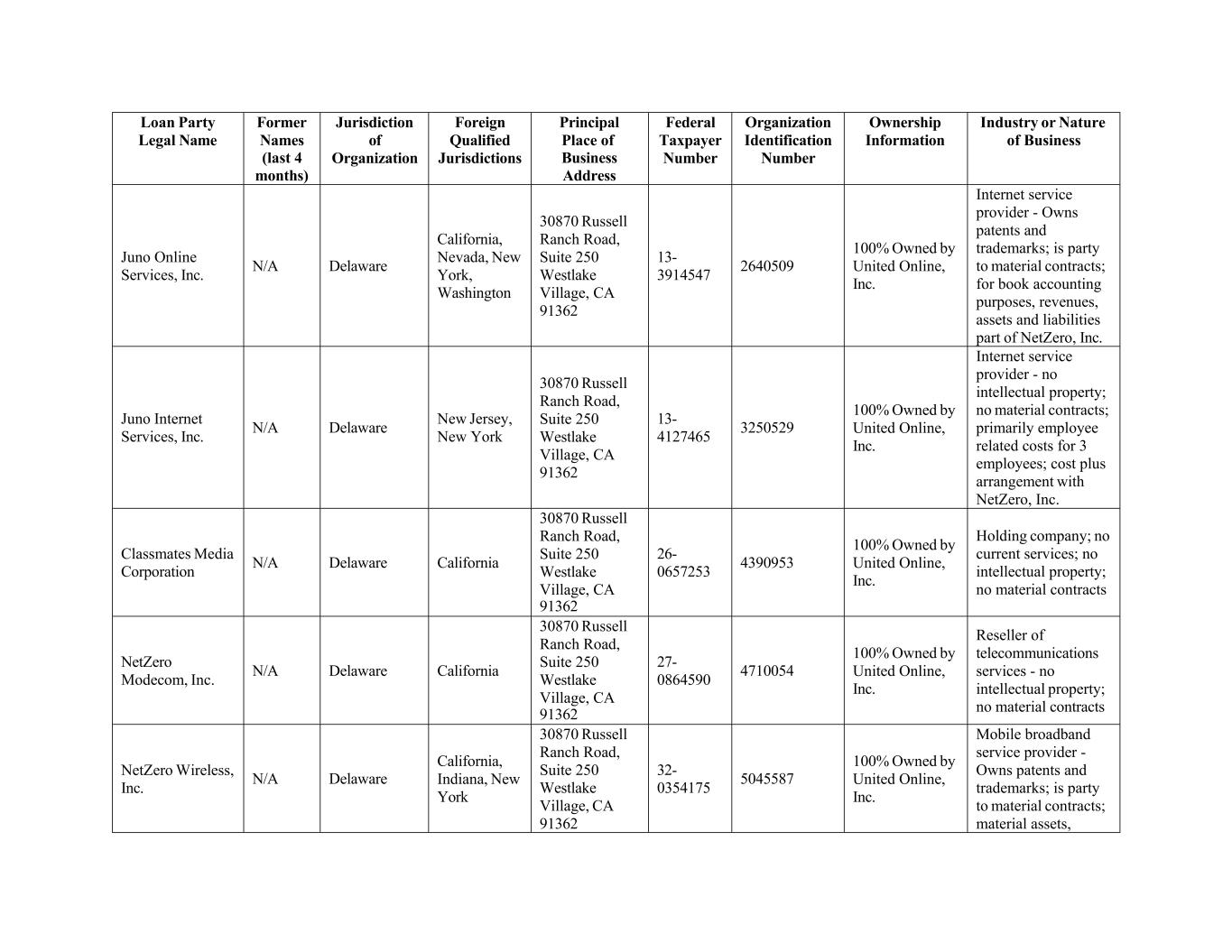 Loan Party Legal Name Former Names (last 4 months) Jurisdiction of Organization Foreign Qualified Jurisdictions Principal Place of Business Address Federal Taxpayer Number Organization Identification Number Ownership Information Industry or Nature of Business Juno Online Services, Inc. N/A Delaware California, Nevada, New York, Washington 30870 Russell Ranch Road, Suite 250 Westlake Village, CA 91362 13- 3914547 2640509 100% Owned by United Online, Inc. Internet service provider - Owns patents and trademarks; is party to material contracts; for book accounting purposes, revenues, assets and liabilities part of NetZero, Inc. Juno Internet Services, Inc. N/A Delaware New Jersey, New York 30870 Russell Ranch Road, Suite 250 Westlake Village, CA 91362 13- 4127465 3250529 100% Owned by United Online, Inc. Internet service provider - no intellectual property; no material contracts; primarily employee related costs for 3 employees; cost plus arrangement with NetZero, Inc. Classmates Media Corporation N/A Delaware California 30870 Russell Ranch Road, Suite 250 Westlake Village, CA 91362 26- 0657253 4390953 100% Owned by United Online, Inc. Holding company; no current services; no intellectual property; no material contracts NetZero Modecom, Inc. N/A Delaware California 30870 Russell Ranch Road, Suite 250 Westlake Village, CA 91362 27- 0864590 4710054 100% Owned by United Online, Inc. Reseller of telecommunications services - no intellectual property; no material contracts NetZero Wireless, Inc. N/A Delaware California, Indiana, New York 30870 Russell Ranch Road, Suite 250 Westlake Village, CA 91362 32- 0354175 5045587 100% Owned by United Online, Inc. Mobile broadband service provider - Owns patents and trademarks; is party to material contracts; material assets,