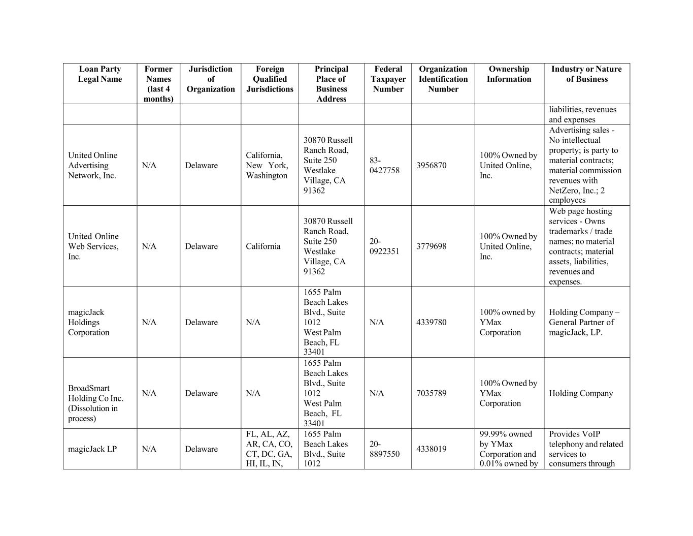 Loan Party Legal Name Former Names (last 4 months) Jurisdiction of Organization Foreign Qualified Jurisdictions Principal Place of Business Address Federal Taxpayer Number Organization Identification Number Ownership Information Industry or Nature of Business liabilities, revenues and expenses United Online Advertising Network, Inc. N/A Delaware California, New York, Washington 30870 Russell Ranch Road, Suite 250 Westlake Village, CA 91362 83- 0427758 3956870 100% Owned by United Online, Inc. Advertising sales - No intellectual property; is party to material contracts; material commission revenues with NetZero, Inc.; 2 employees United Online Web Services, Inc. N/A Delaware California 30870 Russell Ranch Road, Suite 250 Westlake Village, CA 91362 20- 0922351 3779698 100% Owned by United Online, Inc. Web page hosting services - Owns trademarks / trade names; no material contracts; material assets, liabilities, revenues and expenses. magicJack Holdings Corporation N/A Delaware N/A 1655 Palm Beach Lakes Blvd., Suite 1012 West Palm Beach, FL 33401 N/A 4339780 100% owned by YMax Corporation Holding Company – General Partner of magicJack, LP. BroadSmart Holding Co Inc. (Dissolution in process) N/A Delaware N/A 1655 Palm Beach Lakes Blvd., Suite 1012 West Palm Beach, FL 33401 N/A 7035789 100% Owned by YMax Corporation Holding Company magicJack LP N/A Delaware FL, AL, AZ, AR, CA, CO, CT, DC, GA, HI, IL, IN, 1655 Palm Beach Lakes Blvd., Suite 1012 20- 8897550 4338019 99.99% owned by YMax Corporation and 0.01% owned by Provides VoIP telephony and related services to consumers through