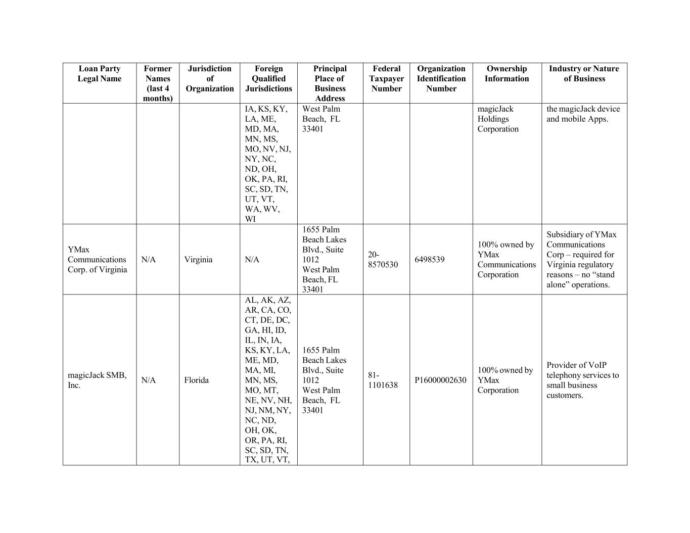 Loan Party Legal Name Former Names (last 4 months) Jurisdiction of Organization Foreign Qualified Jurisdictions Principal Place of Business Address Federal Taxpayer Number Organization Identification Number Ownership Information Industry or Nature of Business IA, KS, KY, LA, ME, MD, MA, MN, MS, MO, NV, NJ, NY, NC, ND, OH, OK, PA, RI, SC, SD, TN, UT, VT, WA, WV, WI West Palm Beach, FL 33401 magicJack Holdings Corporation the magicJack device and mobile Apps. YMax Communications Corp. of Virginia N/A Virginia N/A 1655 Palm Beach Lakes Blvd., Suite 1012 West Palm Beach, FL 33401 20- 8570530 6498539 100% owned by YMax Communications Corporation Subsidiary of YMax Communications Corp – required for Virginia regulatory reasons – no “stand alone” operations. magicJack SMB, Inc. N/A Florida AL, AK, AZ, AR, CA, CO, CT, DE, DC, GA, HI, ID, IL, IN, IA, KS, KY, LA, ME, MD, MA, MI, MN, MS, MO, MT, NE, NV, NH, NJ, NM, NY, NC, ND, OH, OK, OR, PA, RI, SC, SD, TN, TX, UT, VT, 1655 Palm Beach Lakes Blvd., Suite 1012 West Palm Beach, FL 33401 81- 1101638 P16000002630 100% owned by YMax Corporation Provider of VoIP telephony services to small business customers.