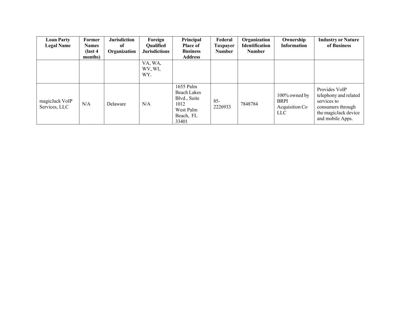 Loan Party Legal Name Former Names (last 4 months) Jurisdiction of Organization Foreign Qualified Jurisdictions Principal Place of Business Address Federal Taxpayer Number Organization Identification Number Ownership Information Industry or Nature of Business VA, WA, WV, WI, WY. magicJack VoIP Services, LLC N/A Delaware N/A 1655 Palm Beach Lakes Blvd., Suite 1012 West Palm Beach, FL 33401 85- 2226933 7848784 100% owned by BRPI Acquisition Co LLC Provides VoIP telephony and related services to consumers through the magicJack device and mobile Apps.