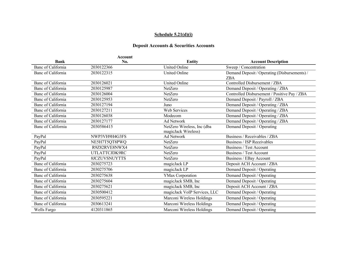 Schedule 5.21(d)(i) Deposit Accounts & Securities Accounts Bank Account No. Entity Account Description Banc of California 2030122366 United Online Sweep / Concentration Banc of California 2030122315 United Online Demand Deposit / Operating (Disbursements) / ZBA Banc of California 2030126021 United Online Controlled Disbursement / ZBA Banc of California 2030125987 NetZero Demand Deposit / Operating / ZBA Banc of California 2030126004 NetZero Controlled Disbursement / Positive Pay / ZBA Banc of California 2030125953 NetZero Demand Deposit / Payroll / ZBA Banc of California 2030127194 Juno Demand Deposit / Operating / ZBA Banc of California 2030127211 Web Services Demand Deposit / Operating / ZBA Banc of California 2030126038 Modecom Demand Deposit / Operating / ZBA Banc of California 2030127177 Ad Network Demand Deposit / Operating / ZBA Banc of California 2030586415 NetZero Wireless, Inc (dba magicJack Wireless) Demand Deposit / Operating PayPal NWP3VH9H4G3FS Ad Network Business / Receivables / ZBA PayPal NE5H7T5QT8PWQ NetZero Business / ISP Receivables PayPal R9Z82RVE8NWX4 NetZero Business / Test Account PayPal UTLATTCJDK9RC NetZero Business / Test Account PayPal 8JCZUVSNUYTTS NetZero Business / EBay Account Banc of California 2030275723 magicJack LP Deposit ACH Account / ZBA Banc of California 2030275706 magicJack LP Demand Deposit / Operating Banc of California 2030275638 YMax Corporation Demand Deposit / Operating Banc of California 2030275604 magicJack SMB, Inc Demand Deposit / Operating Banc of California 2030275621 magicJack SMB, Inc Deposit ACH Account / ZBA Banc of California 2030500412 magicJack VoIP Services, LLC Demand Deposit / Operating Banc of California 2030595221 Marconi Wireless Holdings Demand Deposit / Operating Banc of California 2030613241 Marconi Wireless Holdings Demand Deposit / Operating Wells Fargo 4120311865 Marconi Wireless Holdings Demand Deposit / Operating