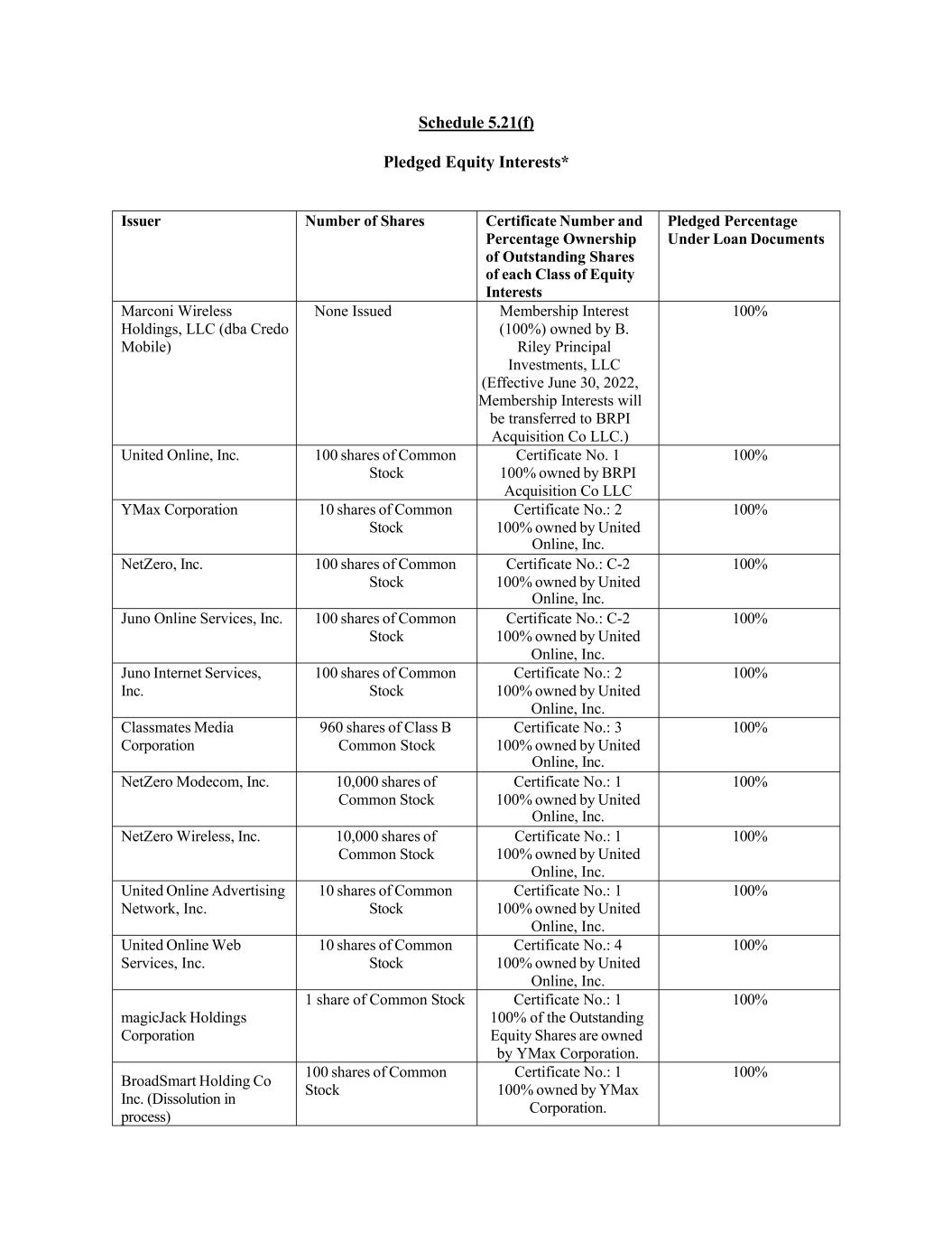 Schedule 5.21(f) Pledged Equity Interests* Issuer Number of Shares Certificate Number and Percentage Ownership of Outstanding Shares of each Class of Equity Interests Pledged Percentage Under Loan Documents Marconi Wireless Holdings, LLC (dba Credo Mobile) None Issued Membership Interest (100%) owned by B. Riley Principal Investments, LLC (Effective June 30, 2022, Membership Interests will be transferred to BRPI Acquisition Co LLC.) 100% United Online, Inc. 100 shares of Common Stock Certificate No. 1 100% owned by BRPI Acquisition Co LLC 100% YMax Corporation 10 shares of Common Stock Certificate No.: 2 100% owned by United Online, Inc. 100% NetZero, Inc. 100 shares of Common Stock Certificate No.: C-2 100% owned by United Online, Inc. 100% Juno Online Services, Inc. 100 shares of Common Stock Certificate No.: C-2 100% owned by United Online, Inc. 100% Juno Internet Services, Inc. 100 shares of Common Stock Certificate No.: 2 100% owned by United Online, Inc. 100% Classmates Media Corporation 960 shares of Class B Common Stock Certificate No.: 3 100% owned by United Online, Inc. 100% NetZero Modecom, Inc. 10,000 shares of Common Stock Certificate No.: 1 100% owned by United Online, Inc. 100% NetZero Wireless, Inc. 10,000 shares of Common Stock Certificate No.: 1 100% owned by United Online, Inc. 100% United Online Advertising Network, Inc. 10 shares of Common Stock Certificate No.: 1 100% owned by United Online, Inc. 100% United Online Web Services, Inc. 10 shares of Common Stock Certificate No.: 4 100% owned by United Online, Inc. 100% magicJack Holdings Corporation 1 share of Common Stock Certificate No.: 1 100% of the Outstanding Equity Shares are owned by YMax Corporation. 100% BroadSmart Holding Co Inc. (Dissolution in process) 100 shares of Common Stock Certificate No.: 1 100% owned by YMax Corporation. 100%
