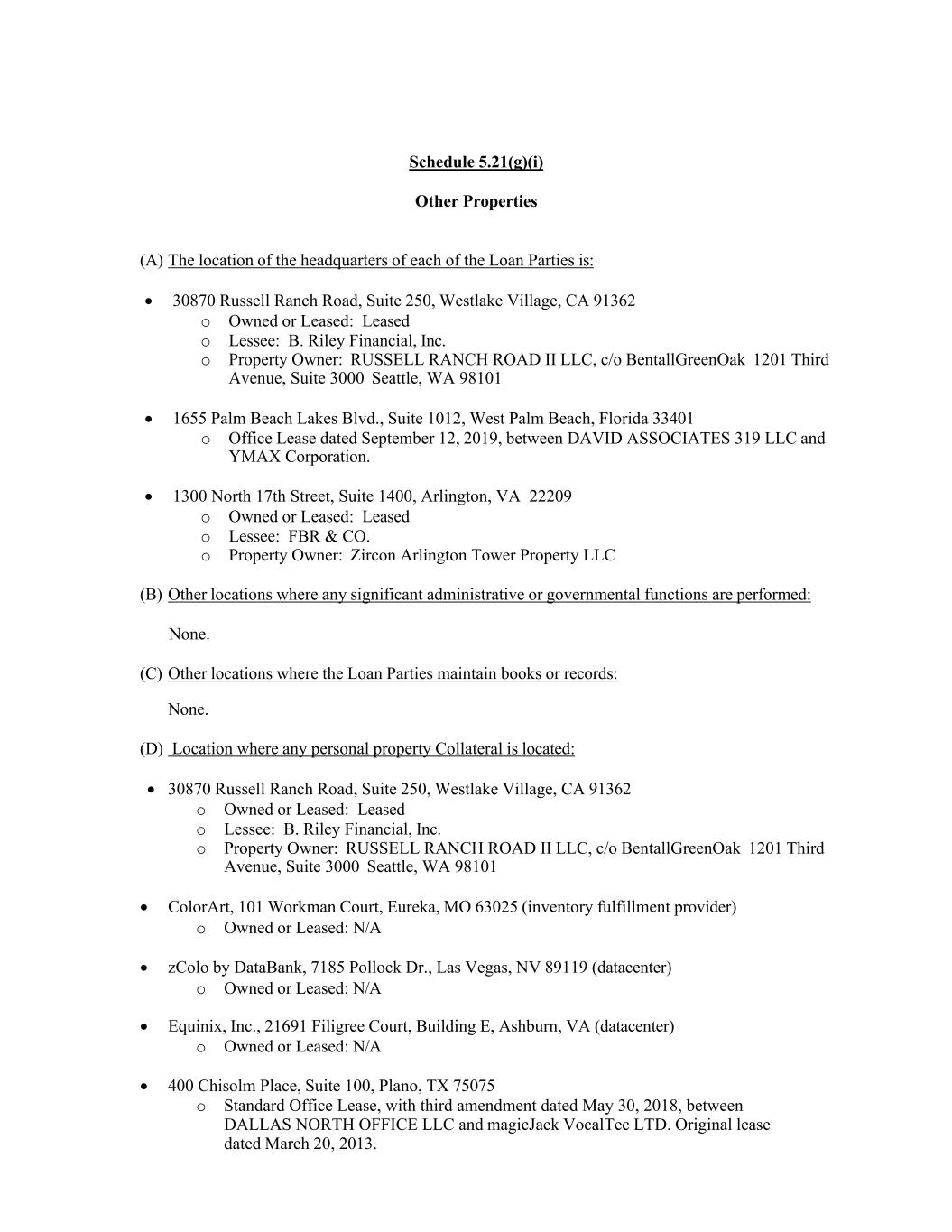 Schedule 5.21(g)(i) Other Properties (A) The location of the headquarters of each of the Loan Parties is: • 30870 Russell Ranch Road, Suite 250, Westlake Village, CA 91362 o Owned or Leased: Leased o Lessee: B. Riley Financial, Inc. o Property Owner: RUSSELL RANCH ROAD II LLC, c/o BentallGreenOak 1201 Third Avenue, Suite 3000 Seattle, WA 98101 • 1655 Palm Beach Lakes Blvd., Suite 1012, West Palm Beach, Florida 33401 o Office Lease dated September 12, 2019, between DAVID ASSOCIATES 319 LLC and YMAX Corporation. • 1300 North 17th Street, Suite 1400, Arlington, VA 22209 o Owned or Leased: Leased o Lessee: FBR & CO. o Property Owner: Zircon Arlington Tower Property LLC (B) Other locations where any significant administrative or governmental functions are performed: None. (C) Other locations where the Loan Parties maintain books or records: None. (D) Location where any personal property Collateral is located: • 30870 Russell Ranch Road, Suite 250, Westlake Village, CA 91362 o Owned or Leased: Leased o Lessee: B. Riley Financial, Inc. o Property Owner: RUSSELL RANCH ROAD II LLC, c/o BentallGreenOak 1201 Third Avenue, Suite 3000 Seattle, WA 98101 • ColorArt, 101 Workman Court, Eureka, MO 63025 (inventory fulfillment provider) o Owned or Leased: N/A • zColo by DataBank, 7185 Pollock Dr., Las Vegas, NV 89119 (datacenter) o Owned or Leased: N/A • Equinix, Inc., 21691 Filigree Court, Building E, Ashburn, VA (datacenter) o Owned or Leased: N/A • 400 Chisolm Place, Suite 100, Plano, TX 75075 o Standard Office Lease, with third amendment dated May 30, 2018, between DALLAS NORTH OFFICE LLC and magicJack VocalTec LTD. Original lease dated March 20, 2013.