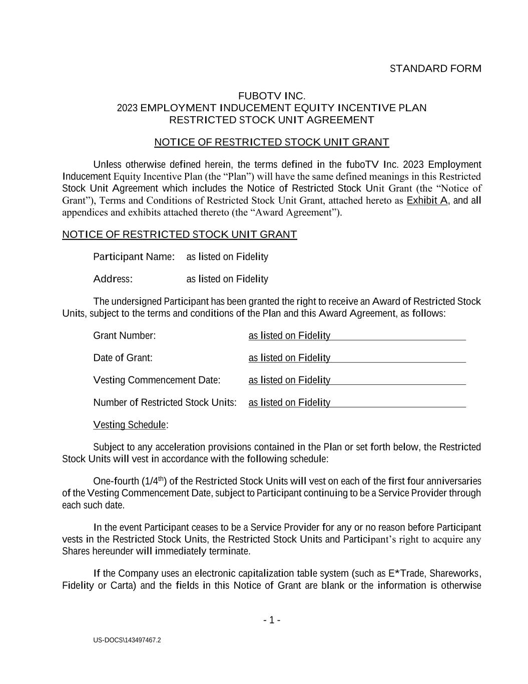 - 1 - US-DOCS\143497467.2 STANDARD FORM FUBOTV INC. 2023 EMPLOYMENT INDUCEMENT EQUITY INCENTIVE PLAN RESTRICTED STOCK UNIT AGREEMENT NOTICE OF RESTRICTED STOCK UNIT GRANT Unless otherwise defined herein, the terms defined in the fuboTV Inc. 2023 Employment Inducement Equity Incentive Plan (the “Plan”) will have the same defined meanings in this Restricted Stock Unit Agreement which includes the Notice of Restricted Stock Unit Grant (the “Notice of Grant”), Terms and Conditions of Restricted Stock Unit Grant, attached hereto as Exhibit A, and all appendices and exhibits attached thereto (the “Award Agreement”). NOTICE OF RESTRICTED STOCK UNIT GRANT Participant Name: as listed on Fidelity Address: as listed on Fidelity The undersigned Participant has been granted the right to receive an Award of Restricted Stock Units, subject to the terms and conditions of the Plan and this Award Agreement, as follows: Grant Number: as listed on Fidelity Date of Grant: as listed on Fidelity Vesting Commencement Date: as listed on Fidelity Number of Restricted Stock Units: as listed on Fidelity Vesting Schedule: Subject to any acceleration provisions contained in the Plan or set forth below, the Restricted Stock Units will vest in accordance with the following schedule: One-fourth (1/4th) of the Restricted Stock Units will vest on each of the first four anniversaries of the Vesting Commencement Date, subject to Participant continuing to be a Service Provider through each such date. In the event Participant ceases to be a Service Provider for any or no reason before Participant vests in the Restricted Stock Units, the Restricted Stock Units and Participant’s right to acquire any Shares hereunder will immediately terminate. If the Company uses an electronic capitalization table system (such as E*Trade, Shareworks, Fidelity or Carta) and the fields in this Notice of Grant are blank or the information is otherwise
