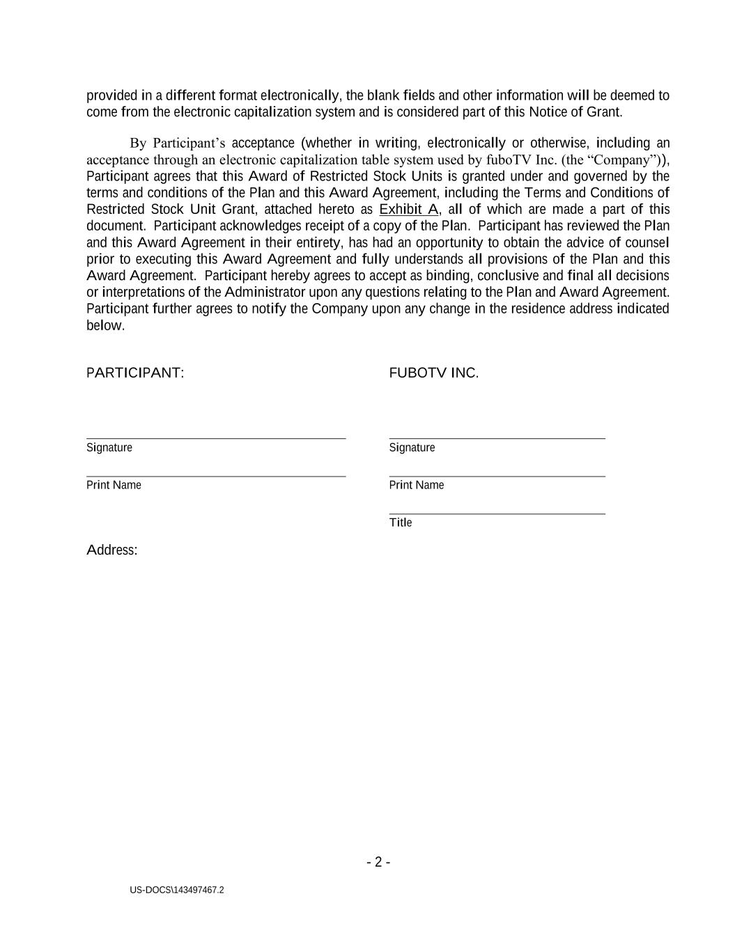 - 2 - US-DOCS\143497467.2 provided in a different format electronically, the blank fields and other information will be deemed to come from the electronic capitalization system and is considered part of this Notice of Grant. By Participant’s acceptance (whether in writing, electronically or otherwise, including an acceptance through an electronic capitalization table system used by fuboTV Inc. (the “Company”)), Participant agrees that this Award of Restricted Stock Units is granted under and governed by the terms and conditions of the Plan and this Award Agreement, including the Terms and Conditions of Restricted Stock Unit Grant, attached hereto as Exhibit A, all of which are made a part of this document. Participant acknowledges receipt of a copy of the Plan. Participant has reviewed the Plan and this Award Agreement in their entirety, has had an opportunity to obtain the advice of counsel prior to executing this Award Agreement and fully understands all provisions of the Plan and this Award Agreement. Participant hereby agrees to accept as binding, conclusive and final all decisions or interpretations of the Administrator upon any questions relating to the Plan and Award Agreement. Participant further agrees to notify the Company upon any change in the residence address indicated below. PARTICIPANT: FUBOTV INC. Signature Signature Print Name Print Name Title Address: